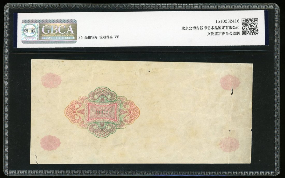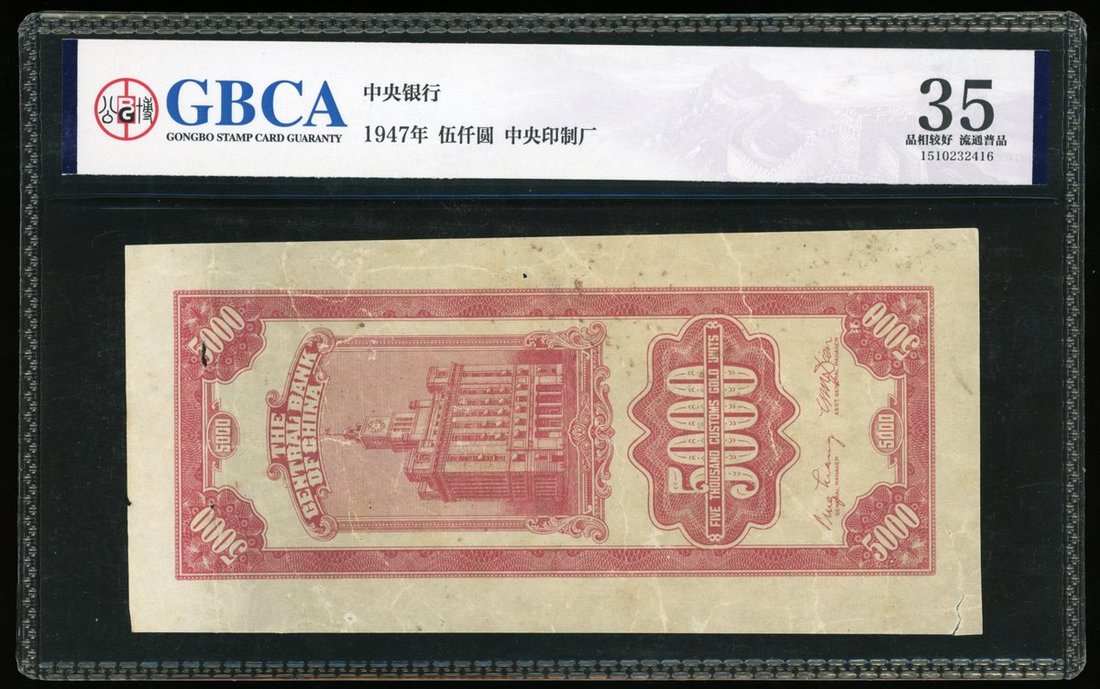 The Central Bank of China, 5000 Customs Gold Units remainder / progressive proof, Year 36 (1947), obverse partially printed with only the guilloche patterns, reverse is printed in full,