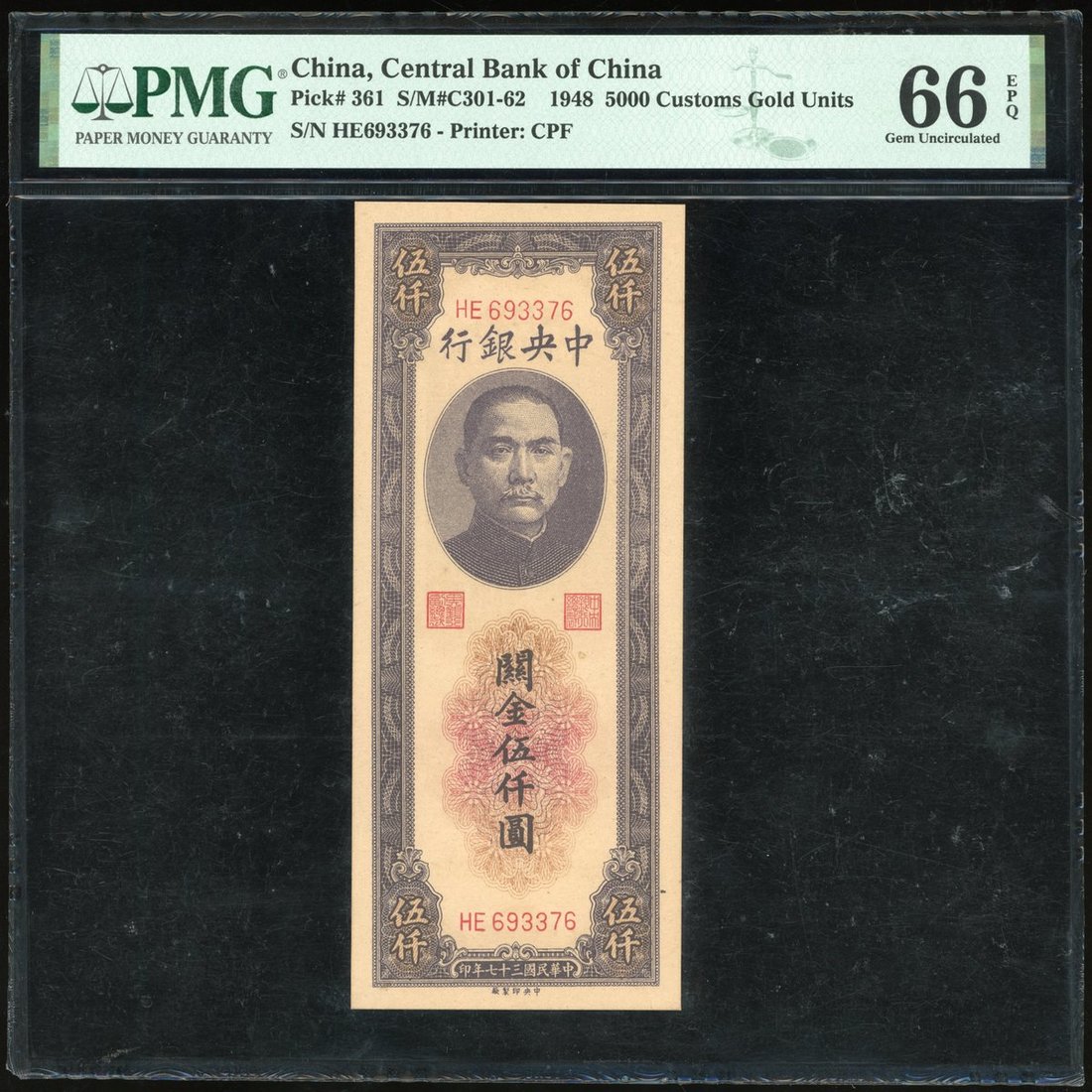 Central Bank of Chinam 5000 customs gold units, Year 37 (1948), serial number HE693376, (Pick 361), PMG 66EPQ
