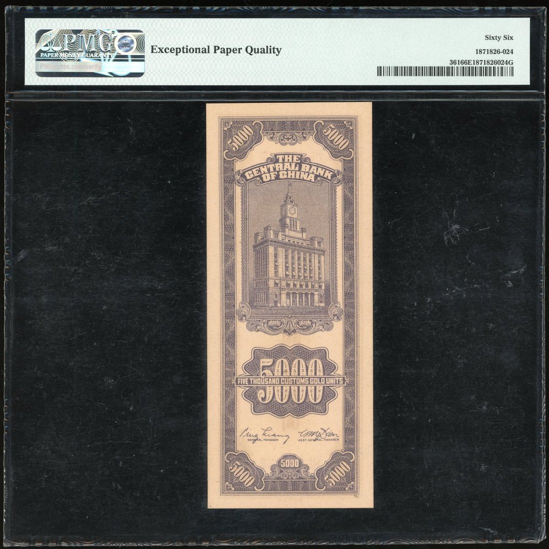 民國三十七年中央銀行關金伍仟圓,編號HE 693376,PMG 66EPQ