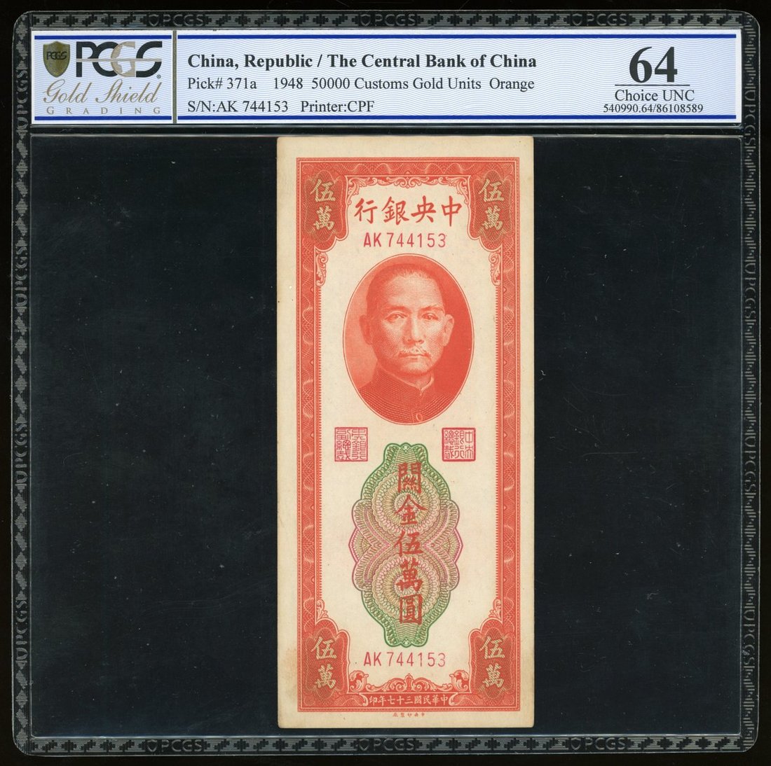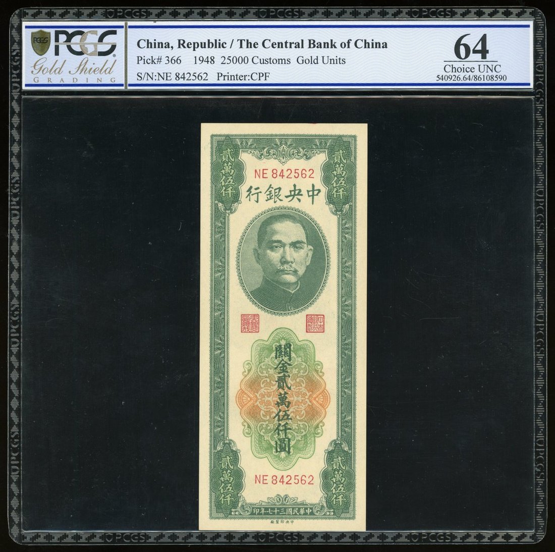 Central Bank of China, a pair, 1948, 25,000 and 50,000 customs gold uints, (Pick 366, 371a), both PCGS 64 (2)