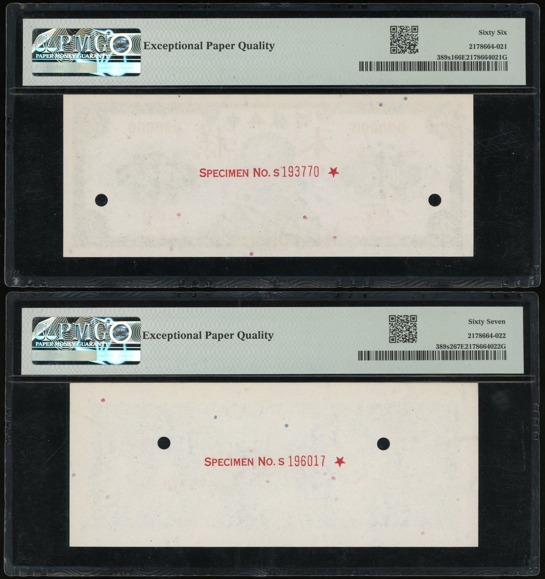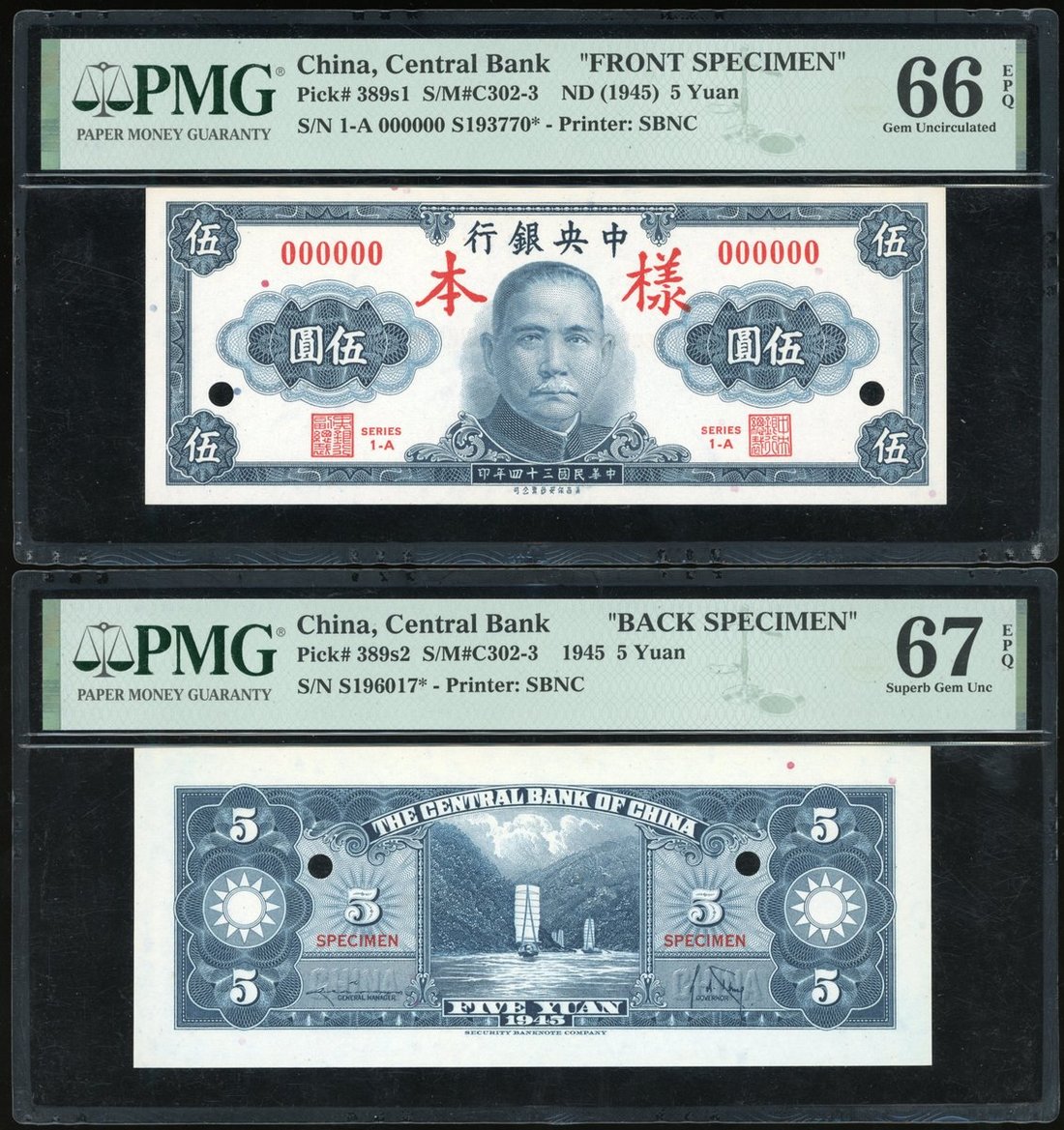 民國三十四年中央銀行伍圓單面正反面樣票,編號000000,PMG分別評66EPQ及67EPQ