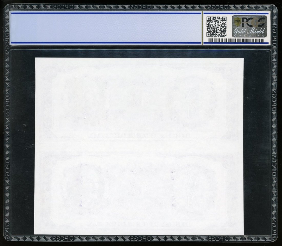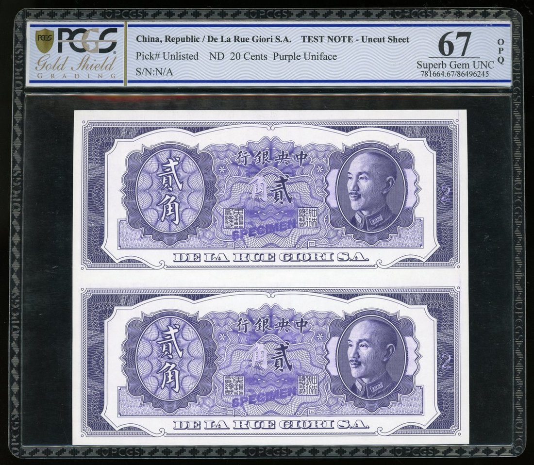 中央銀行貳角單面正面2連體試印票,無日期,紫色及白色,右側有蔣介石,由德納羅印製印製,PCGS 67OPQ