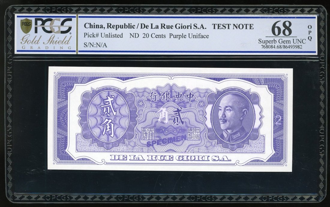 Central Bank of China, uniface obverse 20 cents test notes, ND, purple and white, Chiang Kai Shek at right, printed by De la Rue Giori S.A.,