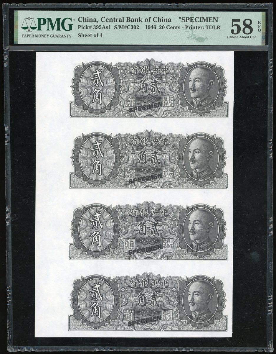 民國三十五年中央銀行貳角4連體樣票,正面黑白,右側有蔣介石,背面綠色,未發行版式,PMG評58EPQ