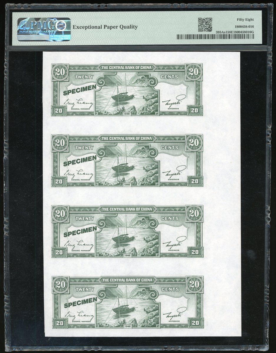 Central Bank of China, an uncut specimen sheet of 4x 20 cents, 1946, black, Chiang Kai Shek at right, reverse green, boats on river at centre,