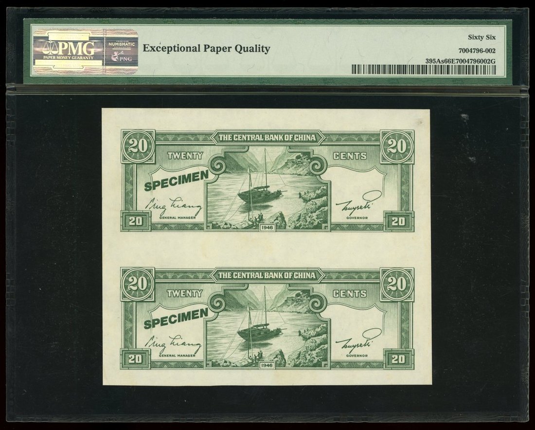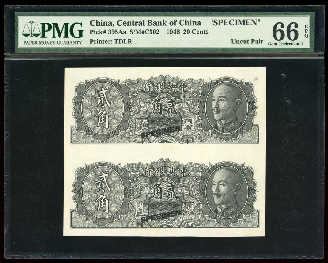 Central Bank of China, an uncut pair of specimen 20 cents, 1946, (Pick 395As), PMG 66EPQ
