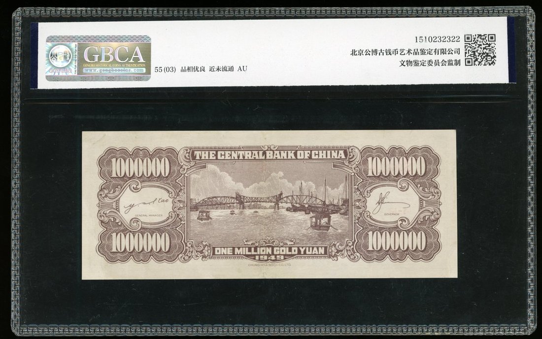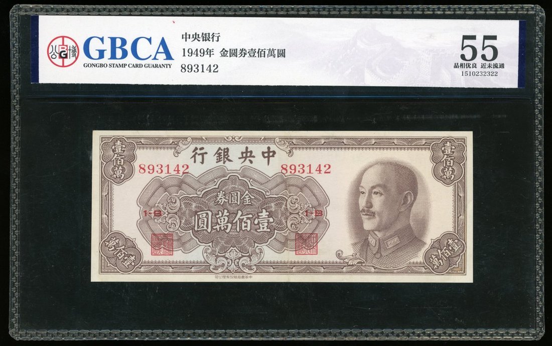 The Central Bank of China, 1 million yuan, 1949, serial number 893142, (Pick 426), Extremely Fine, GBCA 55