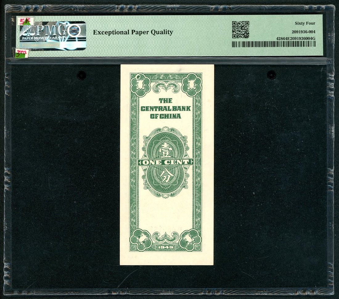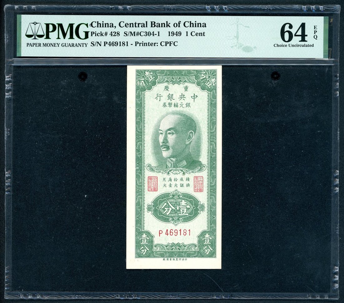 Central Bank of China, 1 cent, 1949, 'ChongQing', serial number P469181, (Pick 428), PMG 64EPQ. High grade original example, third highest grade on PMG Census
