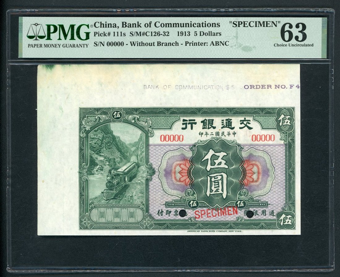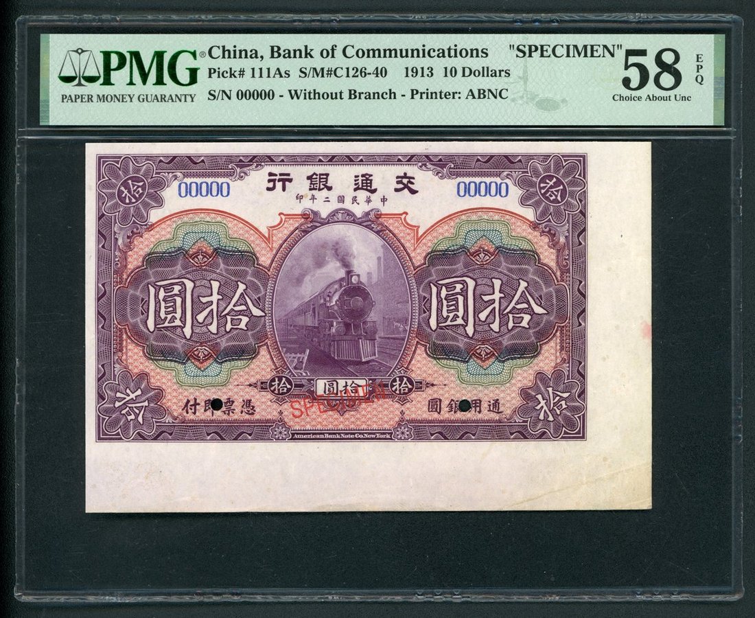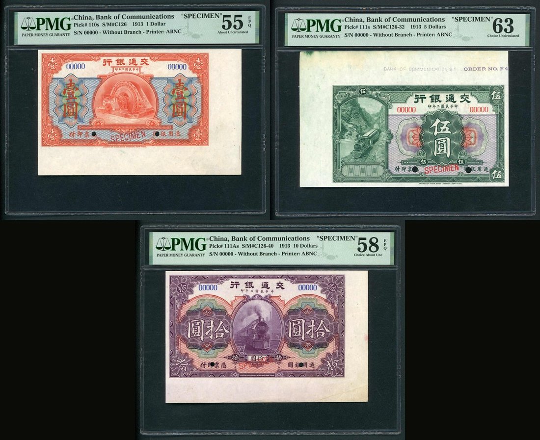Bank of Communications, China, a group of the 1913 SPECIMENS, including 1, 5 and 10 yuan, Year 2 (1913), (Pick 110s, 111s, 111As), PMG 55EPQ, 63, 58EPQ. All with selvage included. Scarcer types (3)