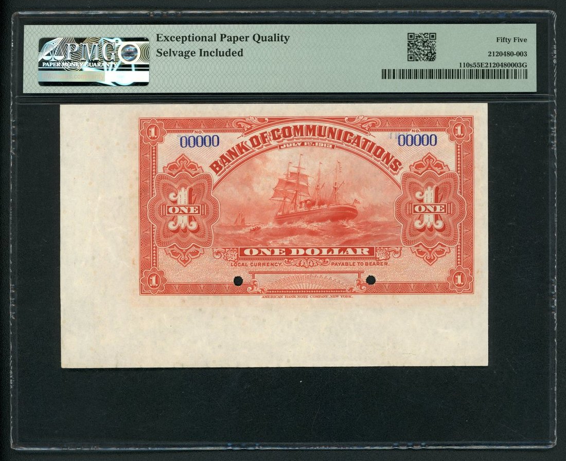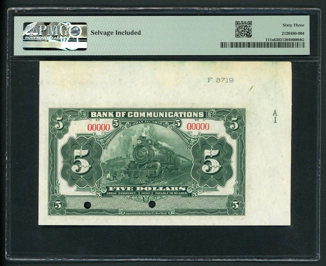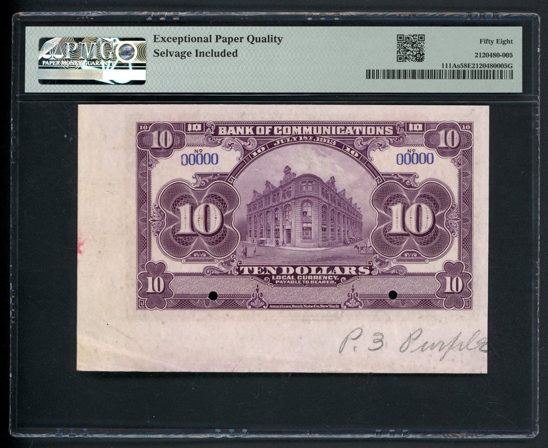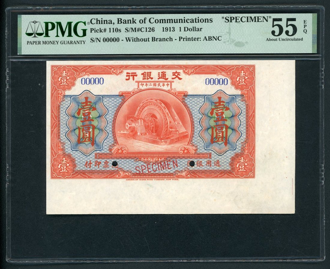 Bank of Communications, China, a group of the 1913 SPECIMENS, including 1, 5 and 10 yuan, Year 2 (1913), (Pick 110s, 111s, 111As), PMG 55EPQ, 63, 58EPQ. All with selvage included. Scarcer types (3)