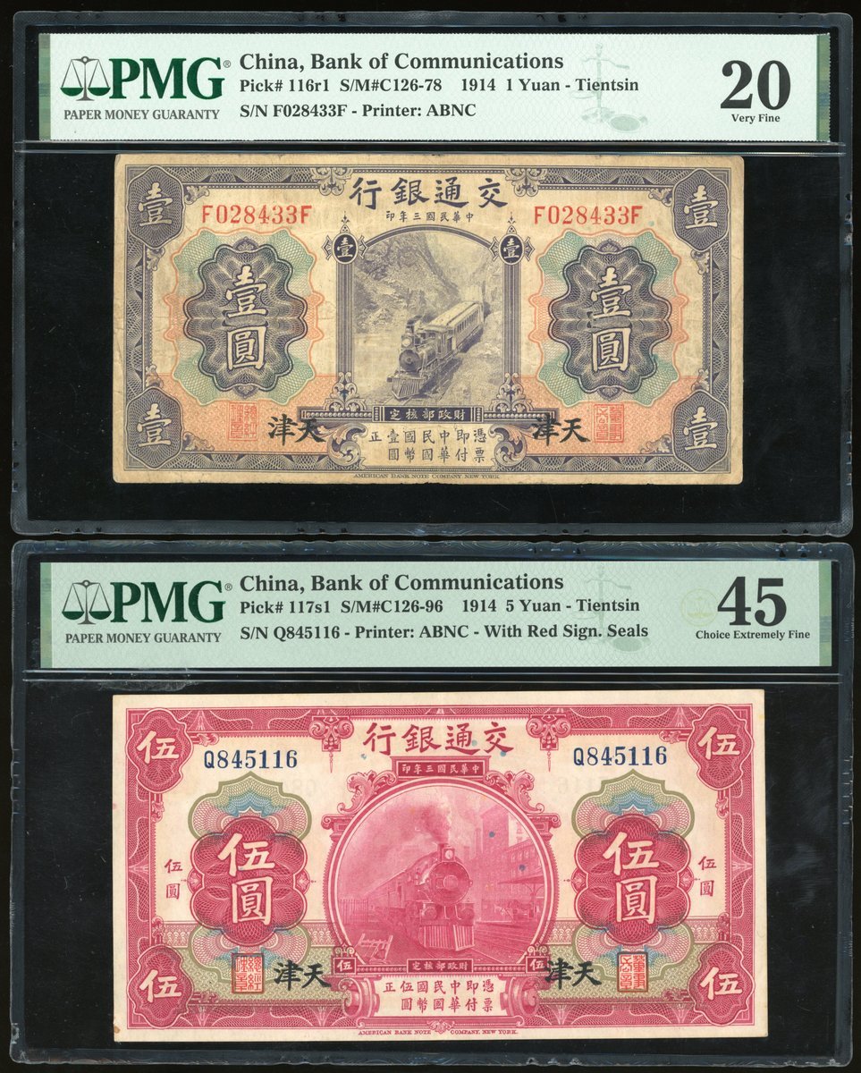 民國三年交通銀行一組3枚,包括:壹圓、伍圓及拾圓,均天津地名,PMG分別評20、45及15(有筆註)