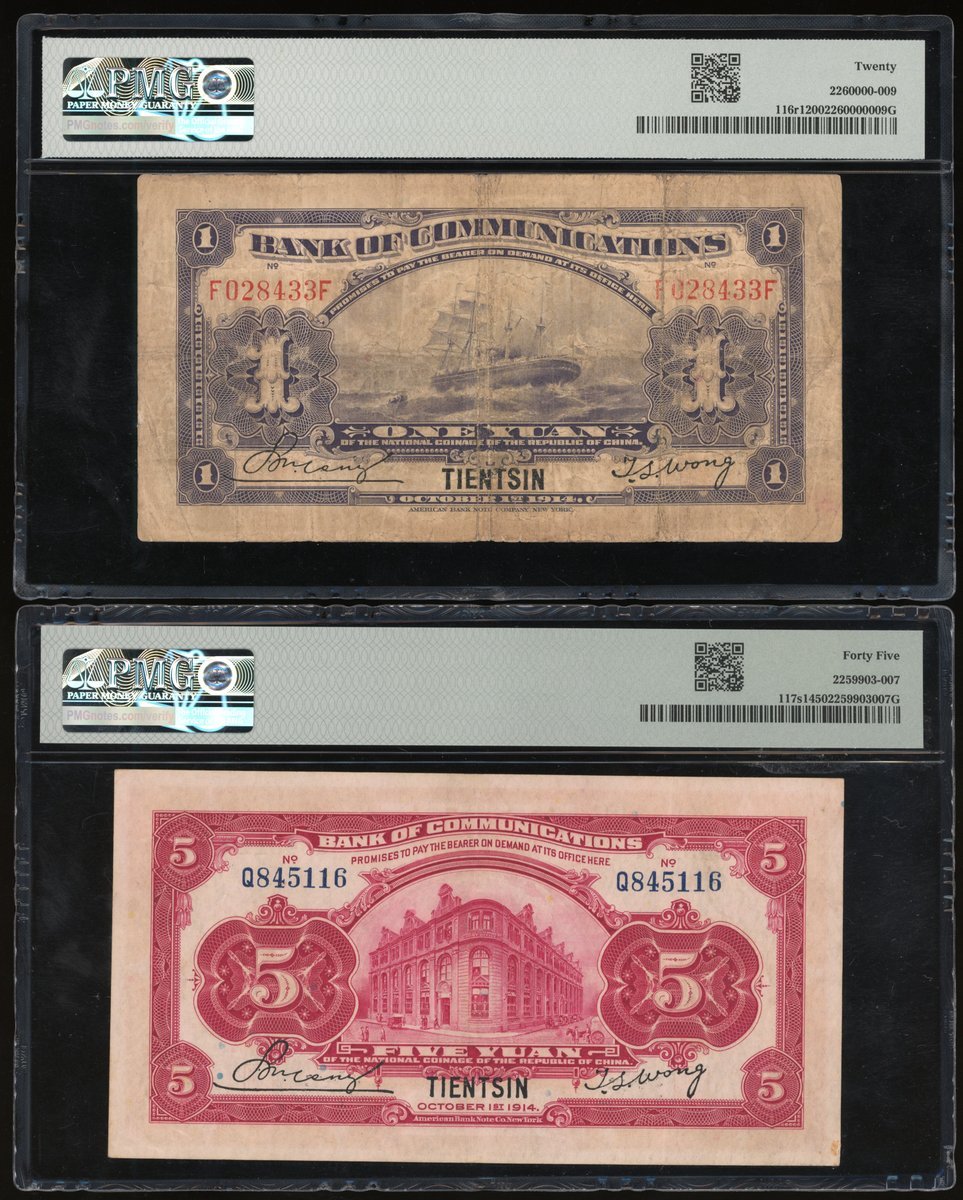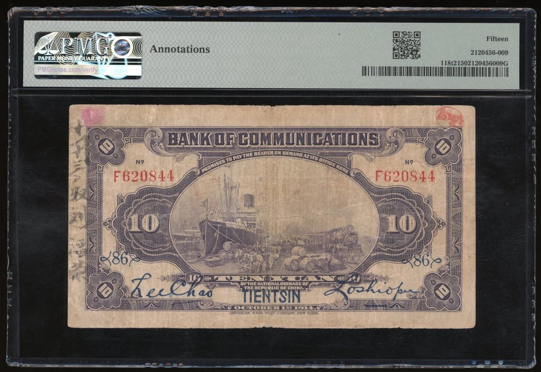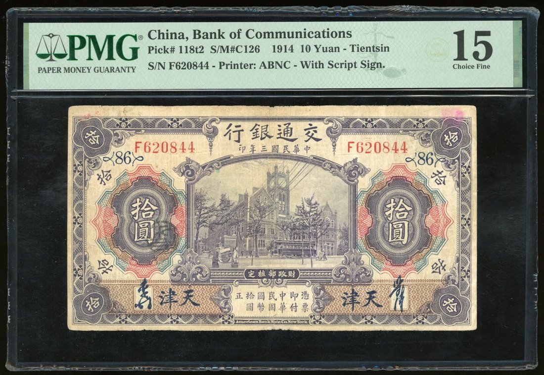 Bank of Communications, China, a group of 3x Tientsin issues, 1914, including 1, 5 and 10 yuan, (Pick 116r1, 117s1, 118t2), PMG 20, 45, 15 (annotation) (3)
