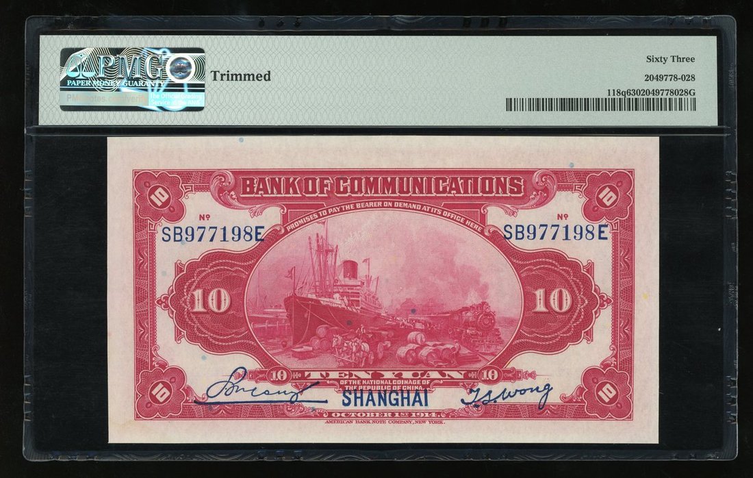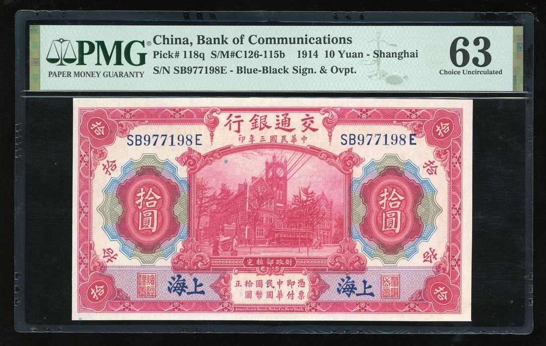 Bank of Communications, China, 10 yuan, 1914, Shanghai, serial number SB 977198 E, (Pick 118q), PMG 63 Choice Uncirculated