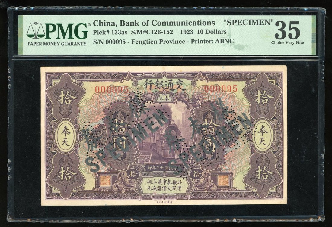 Bank of Communications, China, expedient specimen 10 yuan, Year 12 (1923), Fengtien, low serial number 000095, purple, train at centre,