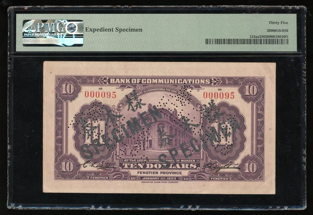 民國十二年交通銀行臨時樣票拾圓,奉天地名,低編號000095,PMG 35。此種樣票形式較為罕見