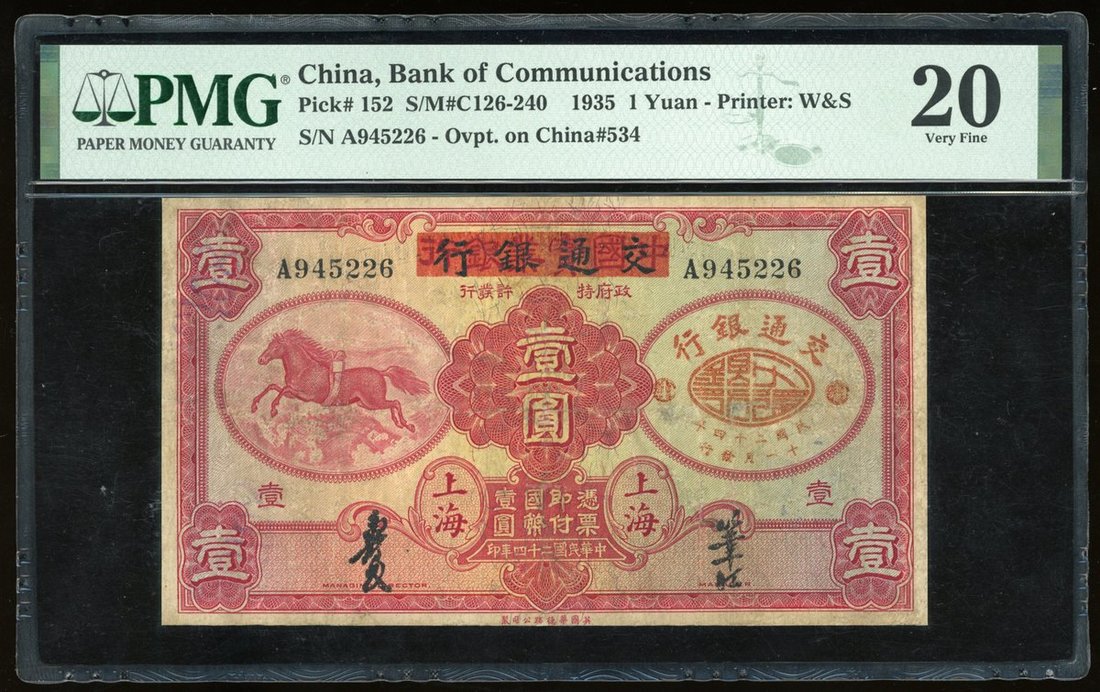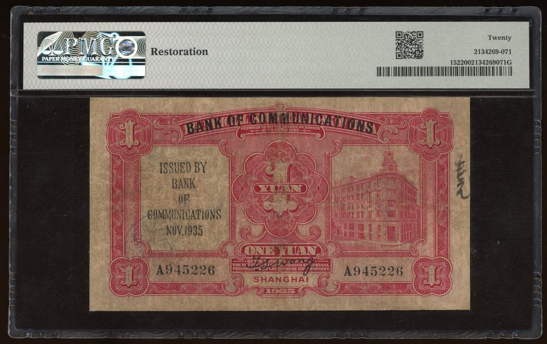 Bank of Communciations, China, 1 yuan, 1935, serial number A 945226, overprinted on the National Industrial Bank of China,