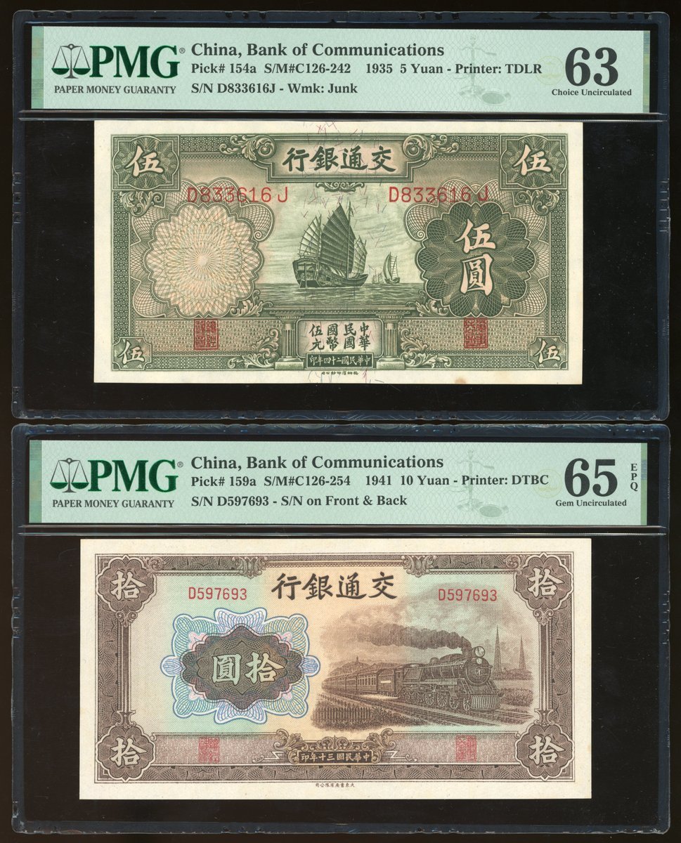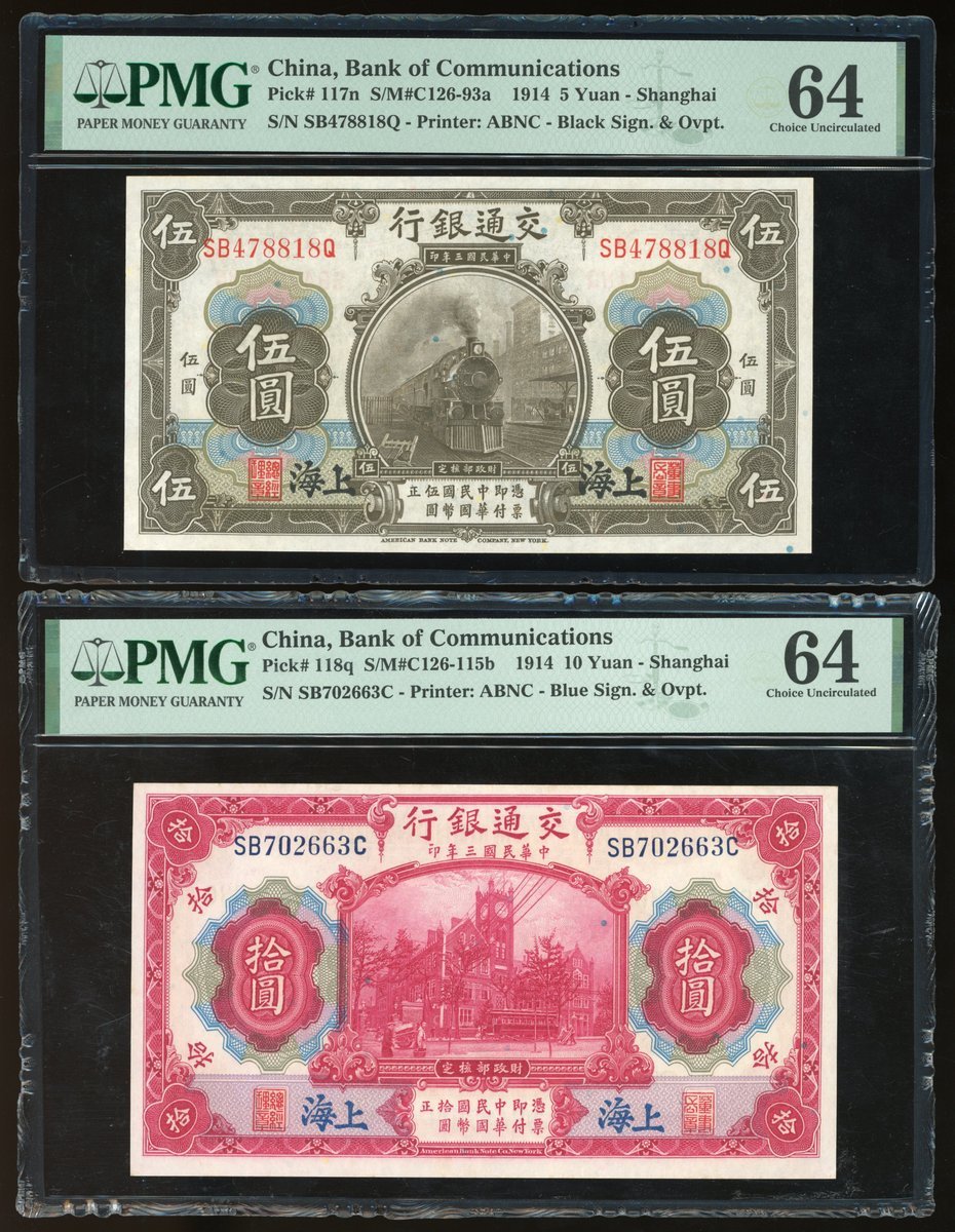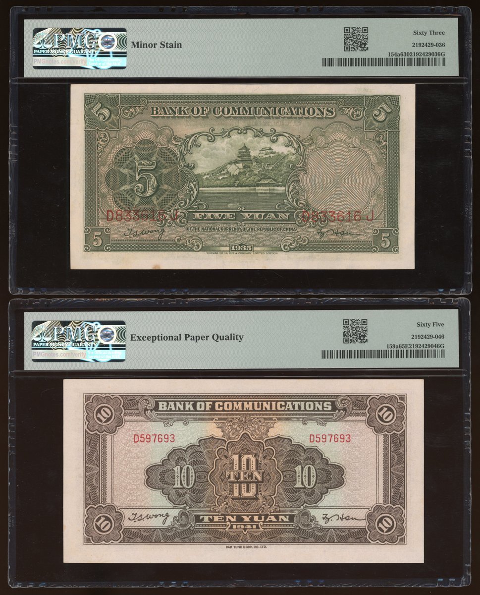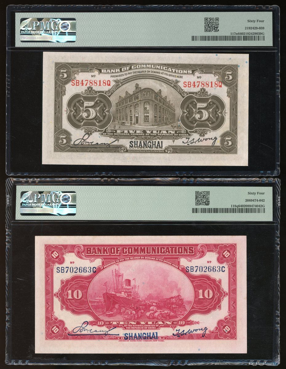 Bank of Communications, China, a group of 4x including, 1914 5 yuan, 1914 10 yuan, 1935 5 yuan, 1941 10 yuan, (Pick 117n, 118q, 154a, 159a), PMG 64, 64, 63, 65EPQ (4)