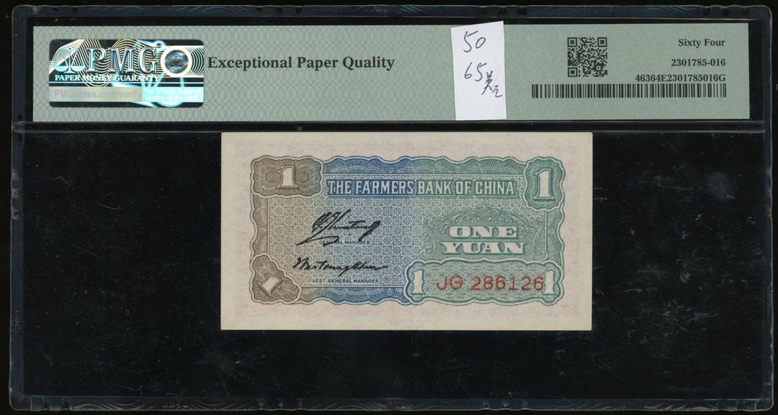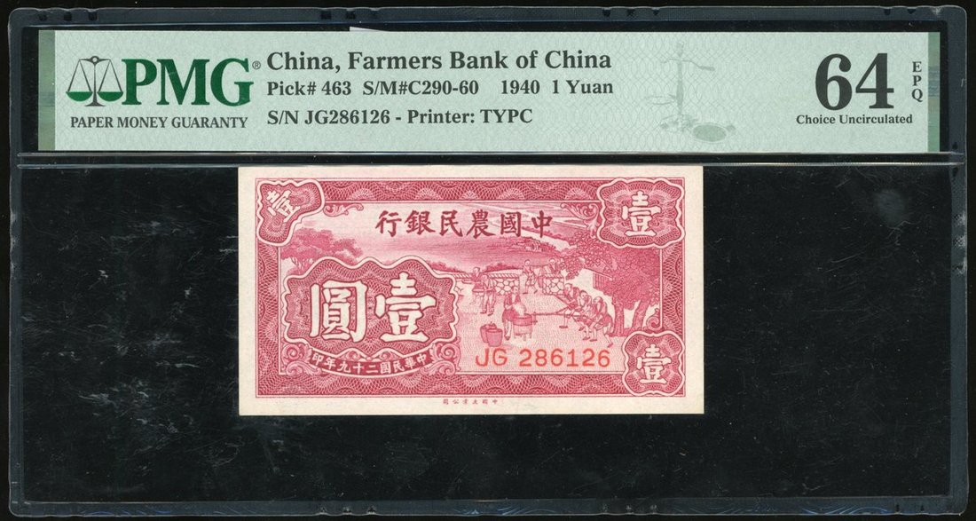 Farmers Bank of China, 1 yuan, 1940, serial number JG286126, (Pick 463), PMG 64EPQ.
