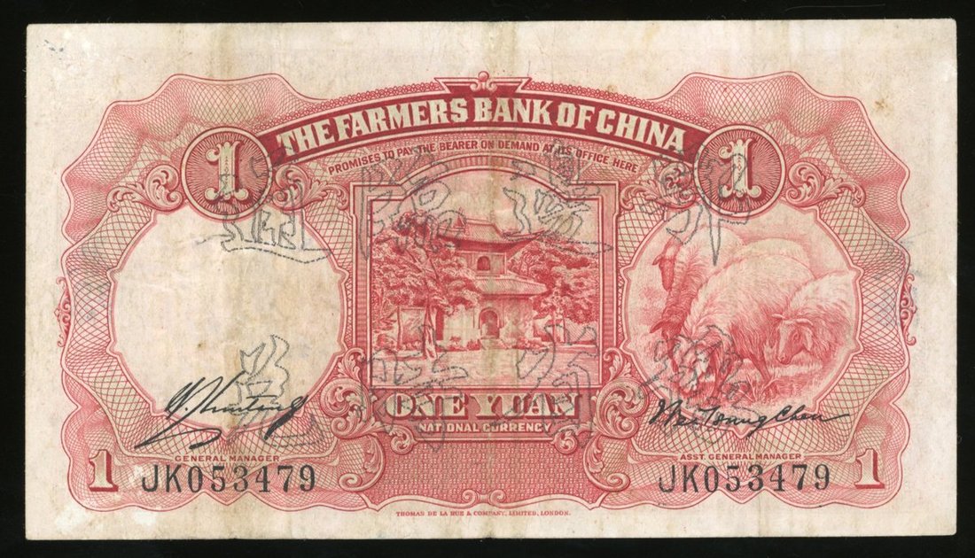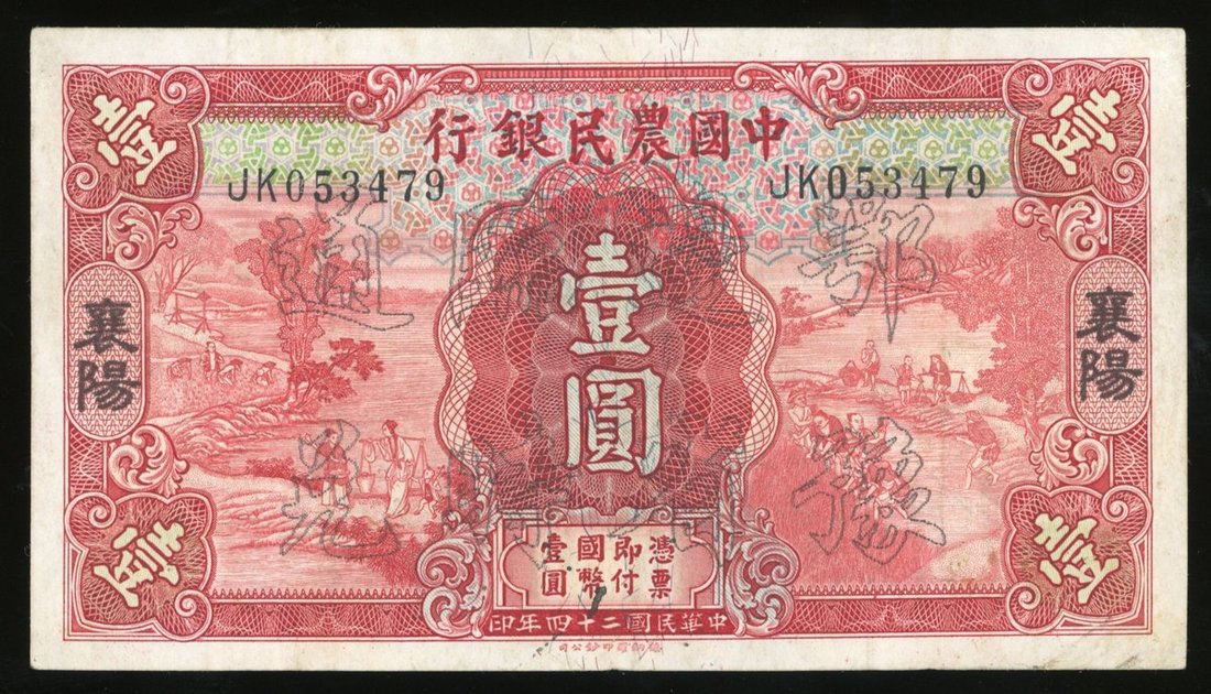 The Farmers Bank of China, 1 yuan, Year 24 (1935), Xiangyang, serial number JK 053479, with overprint for circulation within Hupeh and Honan Provinces,