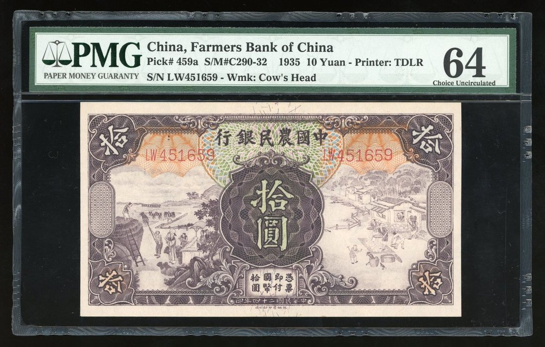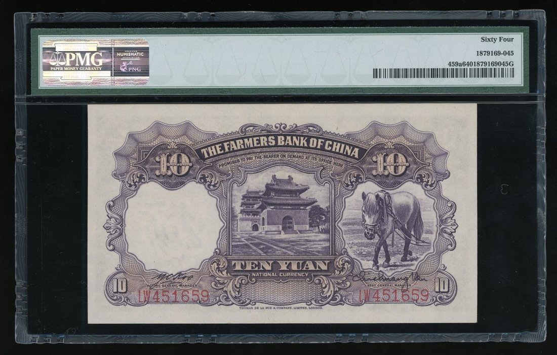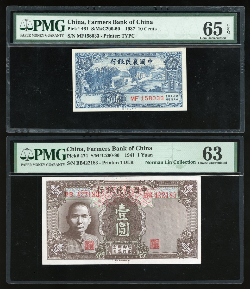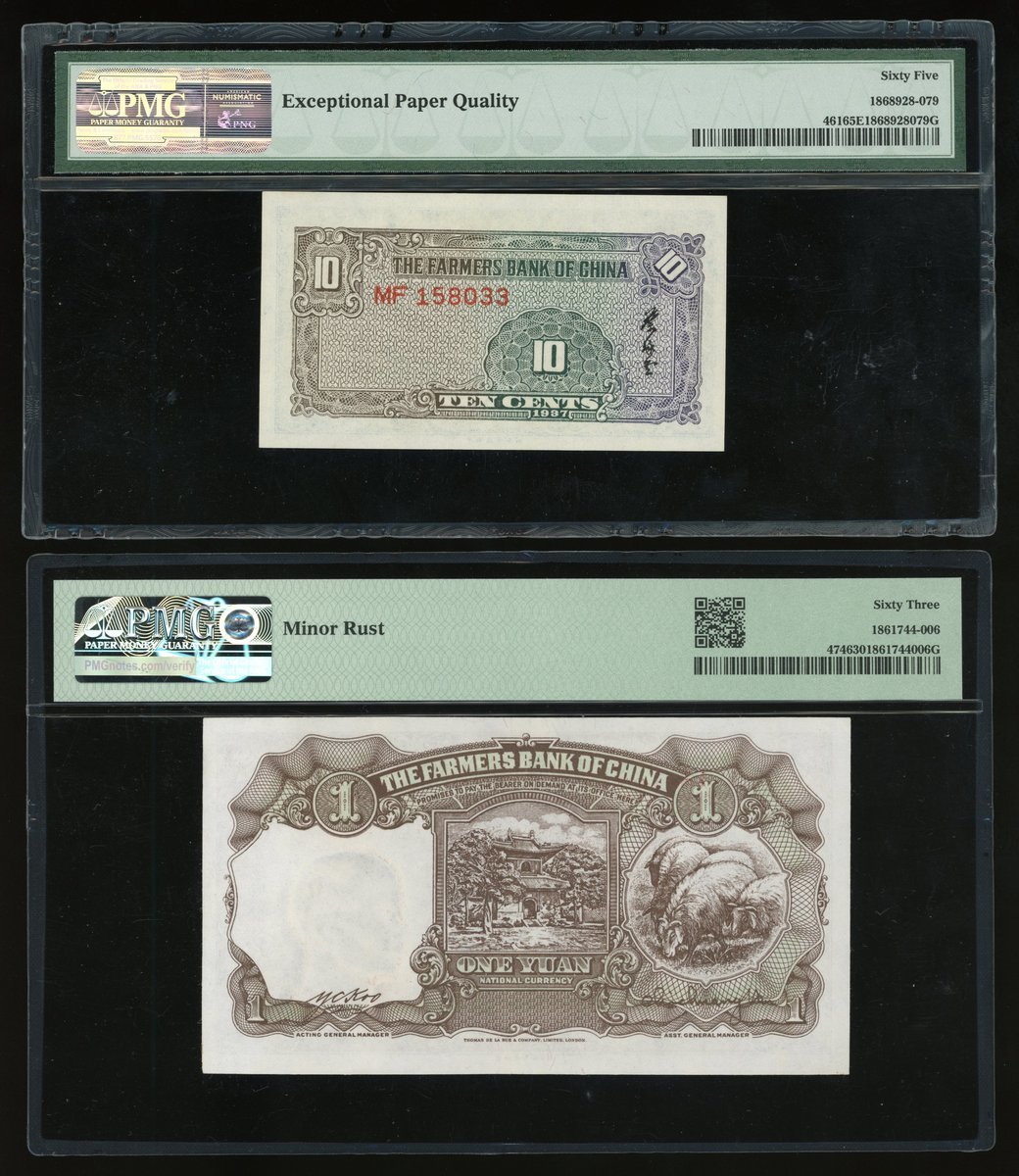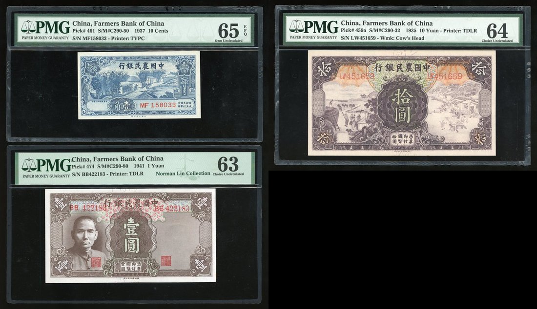 Farmers Bank of China, a lot of 10 cents, 1 yuan and 10 yuan, 1937, 1941 and 1935 respectively, serial number MF158033, BB422183, LW451659, (Pick 461, 474, 459a), PMG 65EPQ, 63, 64 respectively.(3)