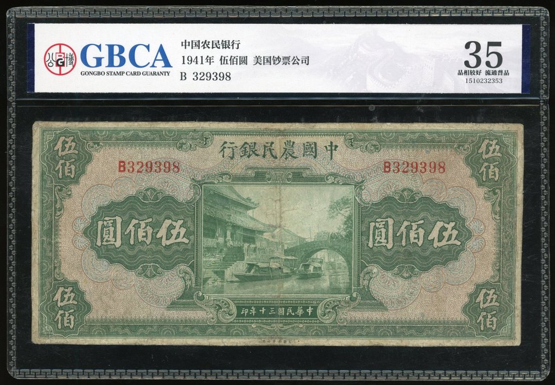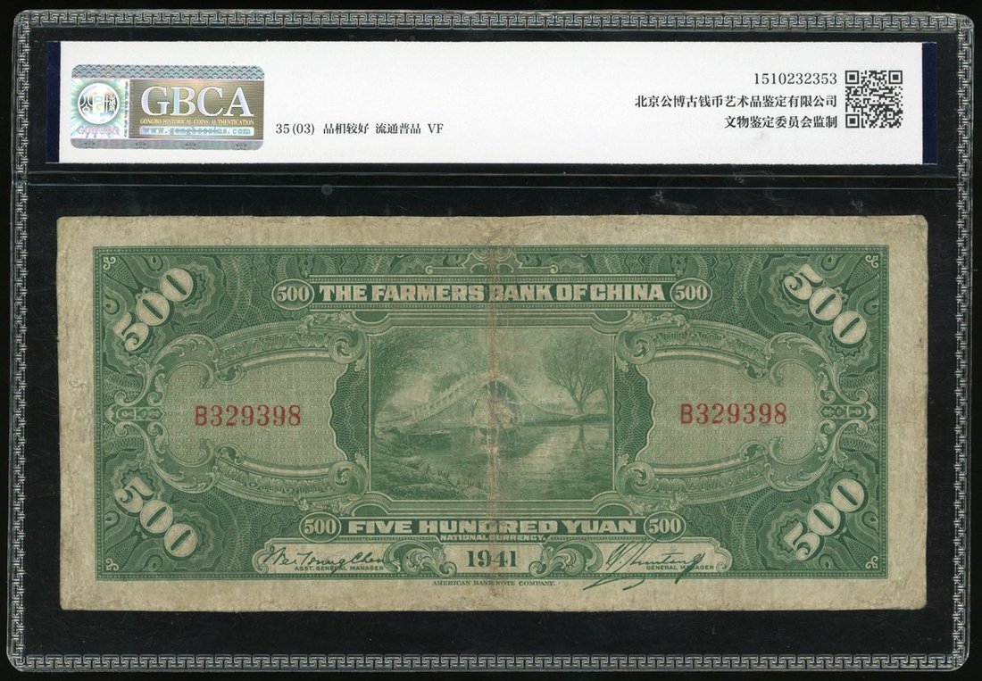 Farmers Bank of China, 500 yuan, 1941, serial number B 329898, (Pick 478a), About Very Fine, GBCA 35