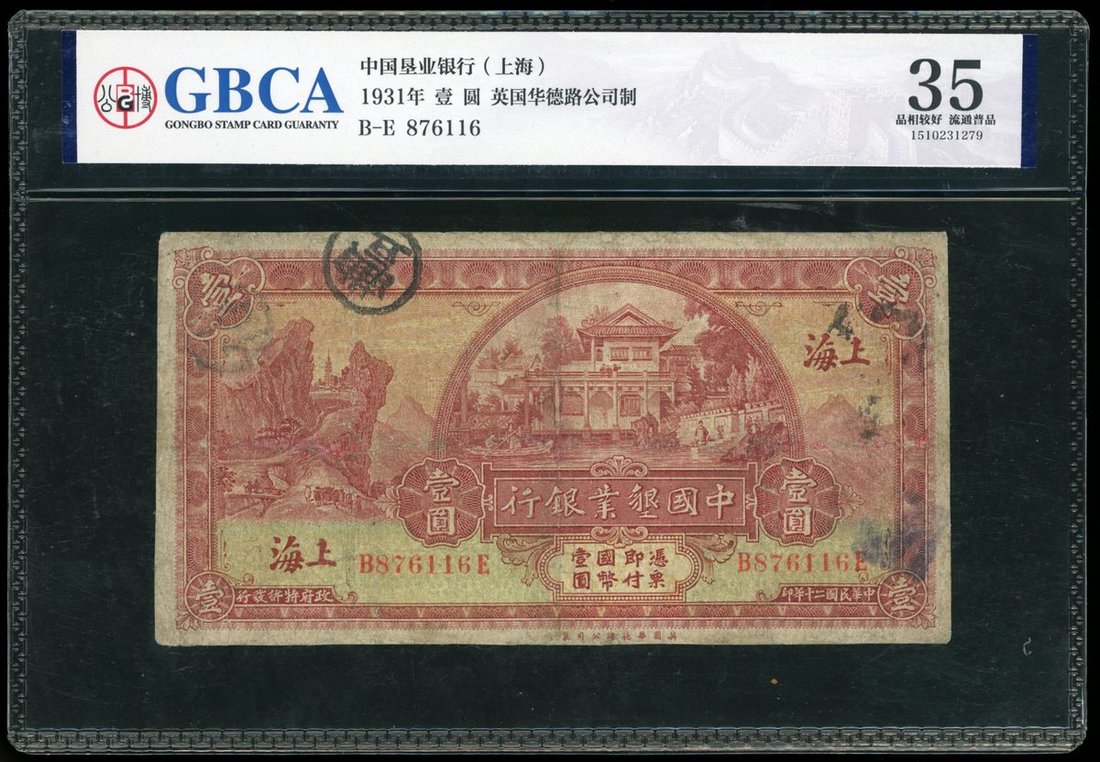1931年中國墾業銀行壹圓,上海,編號B876116E,AVF,有修補,有墨印,GBCA 35