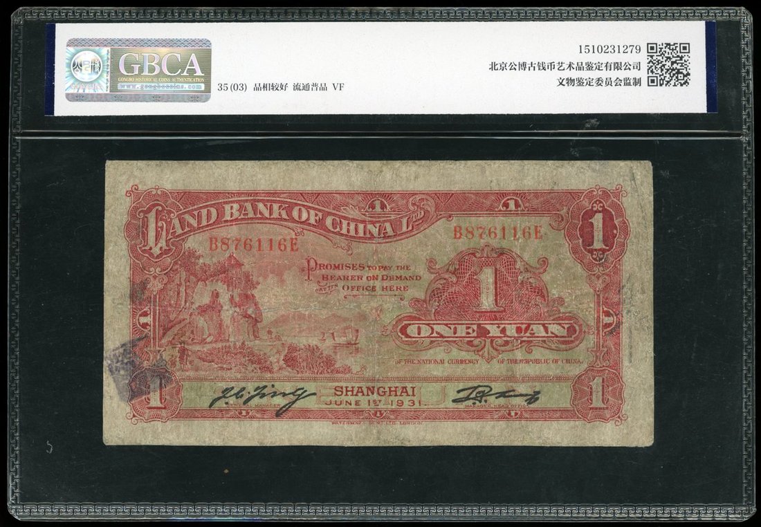 Land Bank of China, 1 yuan, 1931, Shanghai, serial number B 876116 E, (Pick 504), About Very Fine, Repaired, Ink Stamps, GBCA 35