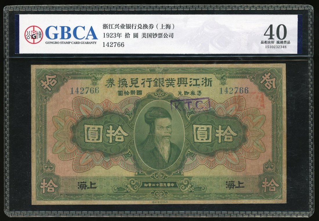 1923年浙江興業銀行兌換券拾圓,編號142766, VF,有印記及書寫,GBCA 40