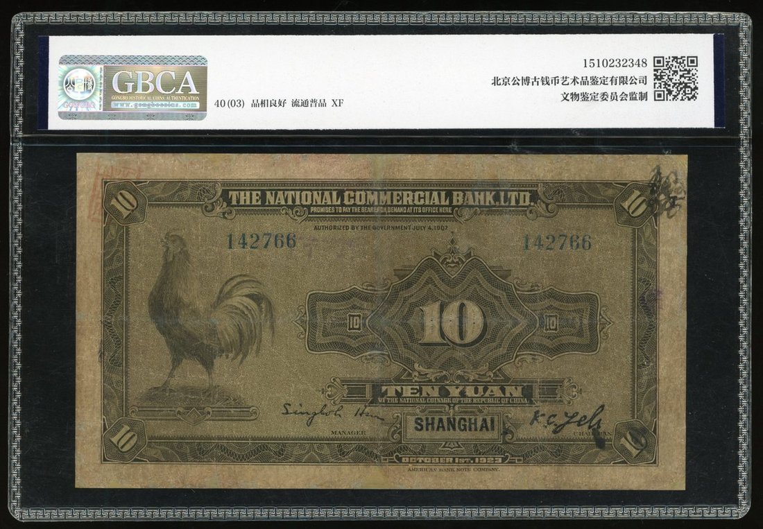 The National Commercial Bank, China, 10 yuan, 1923, Shanghai, serial number 142766, (Pick 519b), Very Fine, Stamps and Annotations, GBCA 40