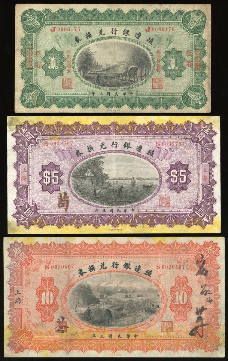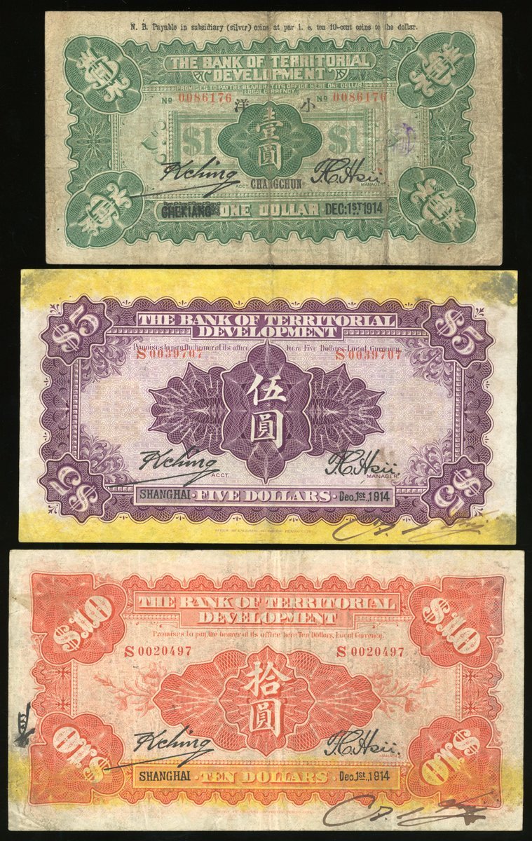 Bank of Territorial Development, China, a set of the 1914 issue, including 1, 5 and 10 yuan, (Pick 566-568), generally fine or better (3)