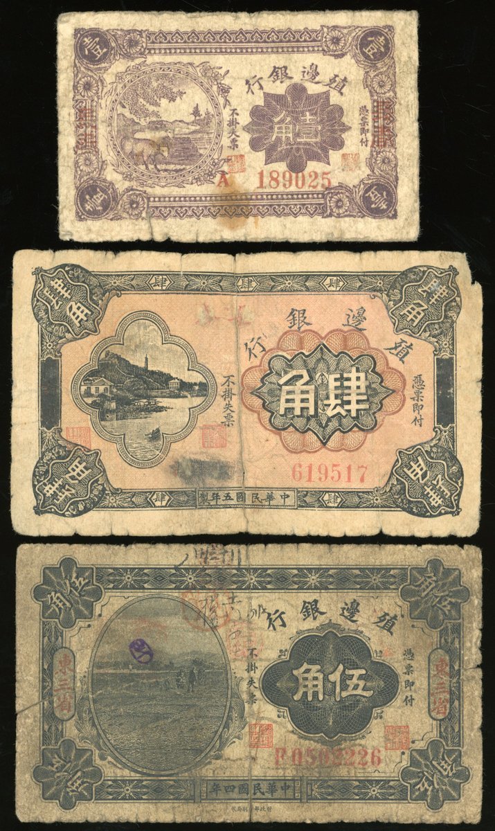 殖邊銀行紙幣一組3枚,包括壹角,肆角及伍角,編號A189025,619517及P0503226,壹角有加蓋,G-F品