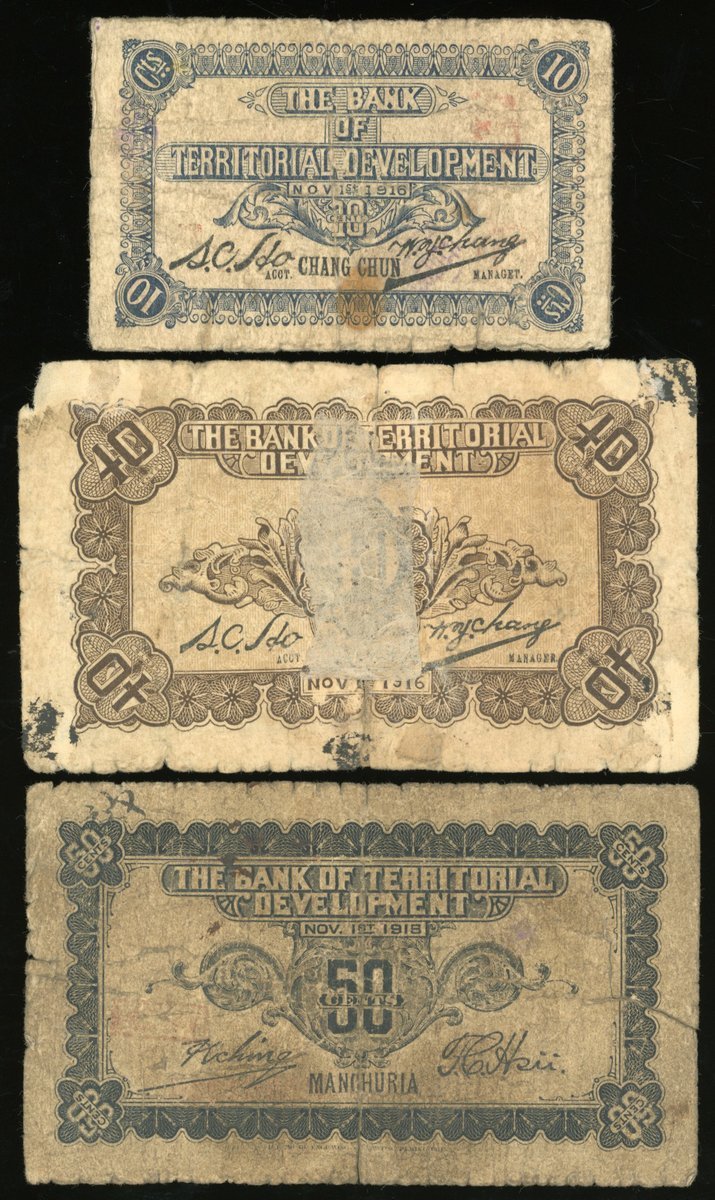 The Bank of Territorial Development, a lot of 10, 40 and 50 cents, 1916, the 50 cents 1915, serial number A189025, 619517 and P0503226, 10 cents overprinted with place name 'Chang Chun', 50 cents 'Manchuria',