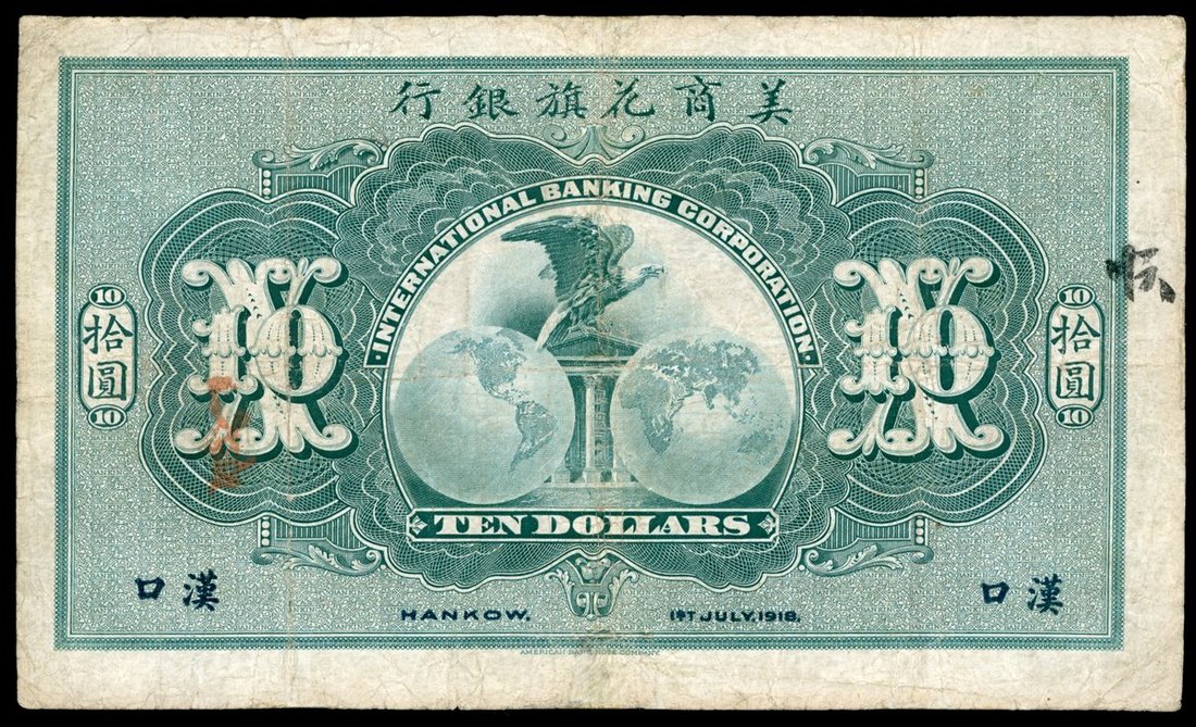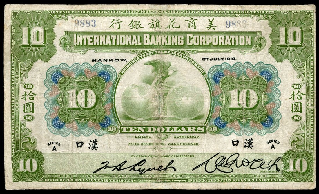 International Banking Corporation, $10, 1918, Hankow, 4 digit serial number 9883, Lynch and North signatures,