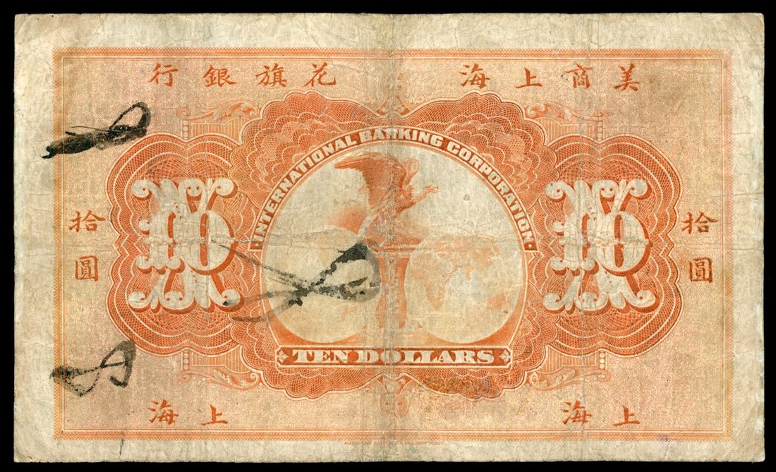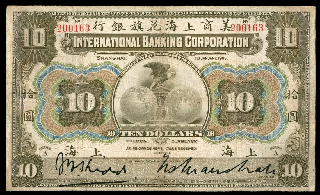International Banking Corporation, $10, 1905, Shanghai, serial number 200163, Kidd and Marshall signatures,