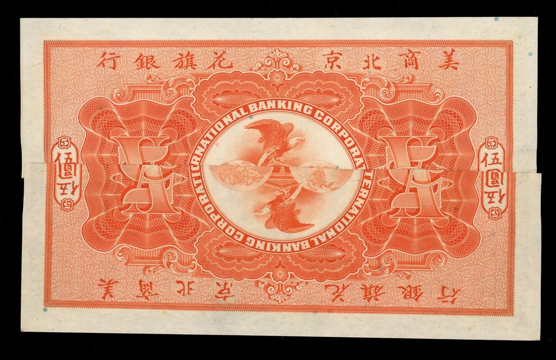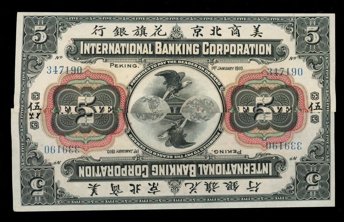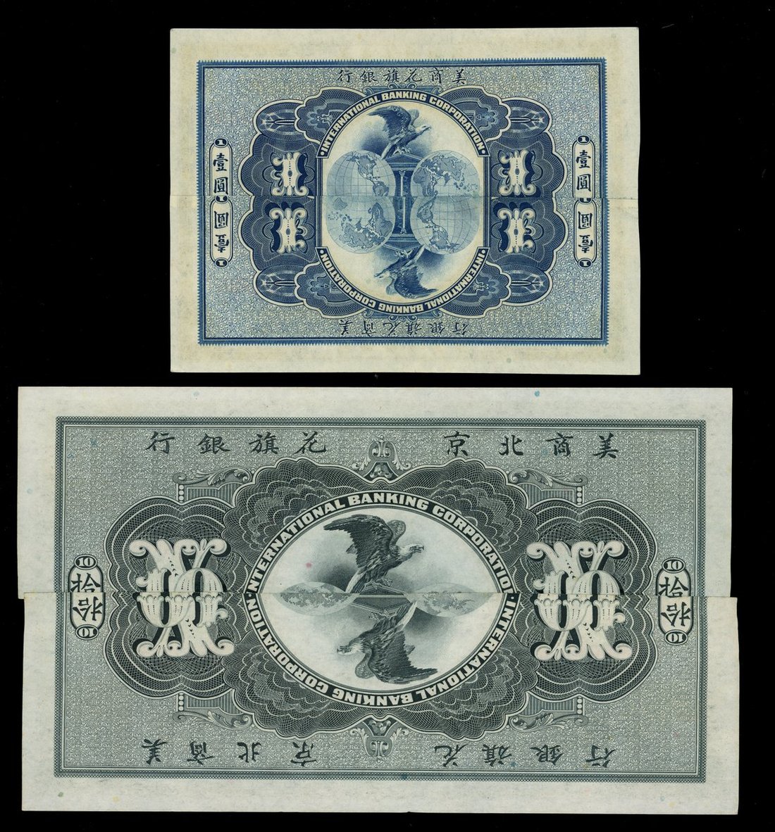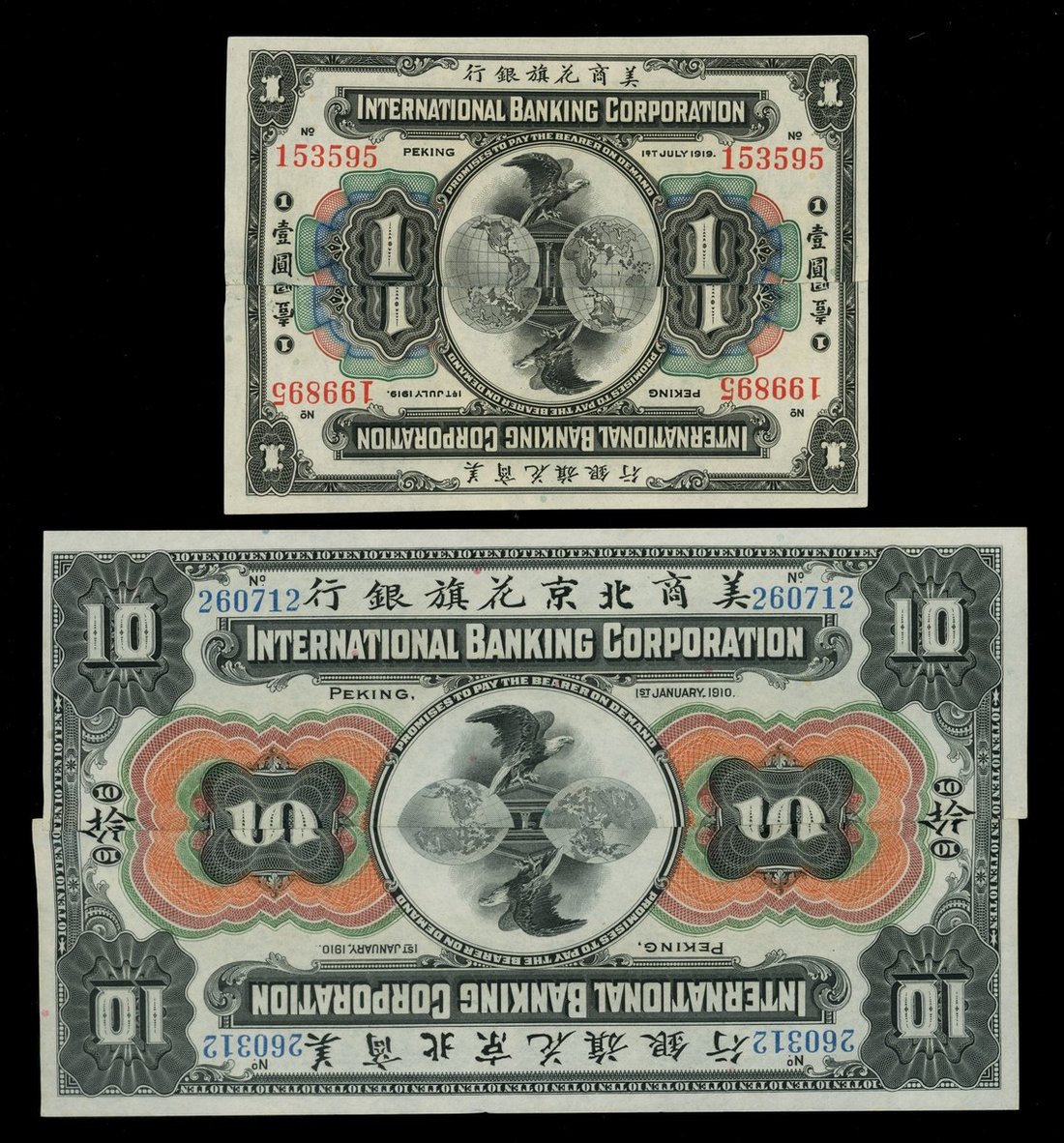 International Banking Corporation, a lot of 1, 5 and 10 dollars, 1919, 1910, Peking, cancelled and only two upper half joined,