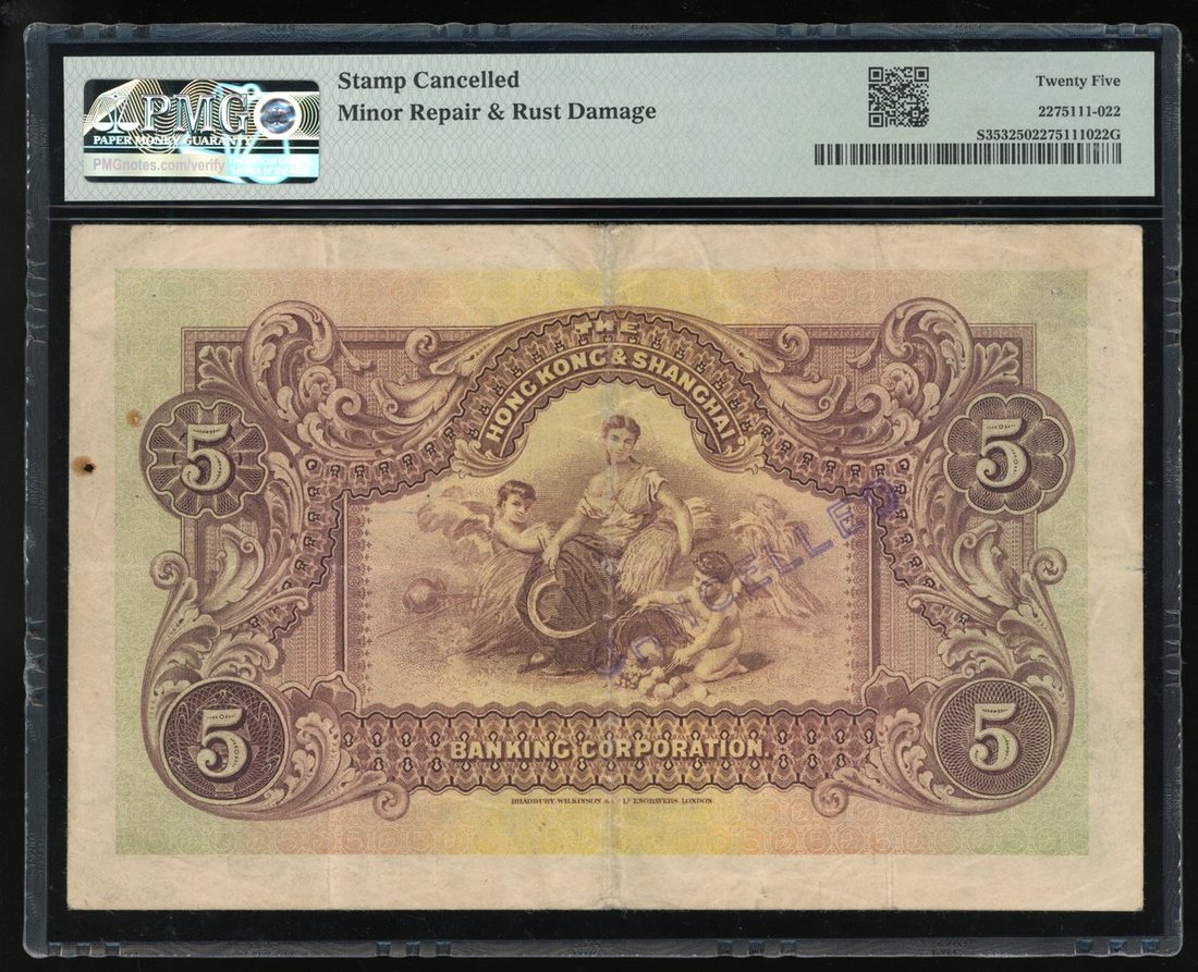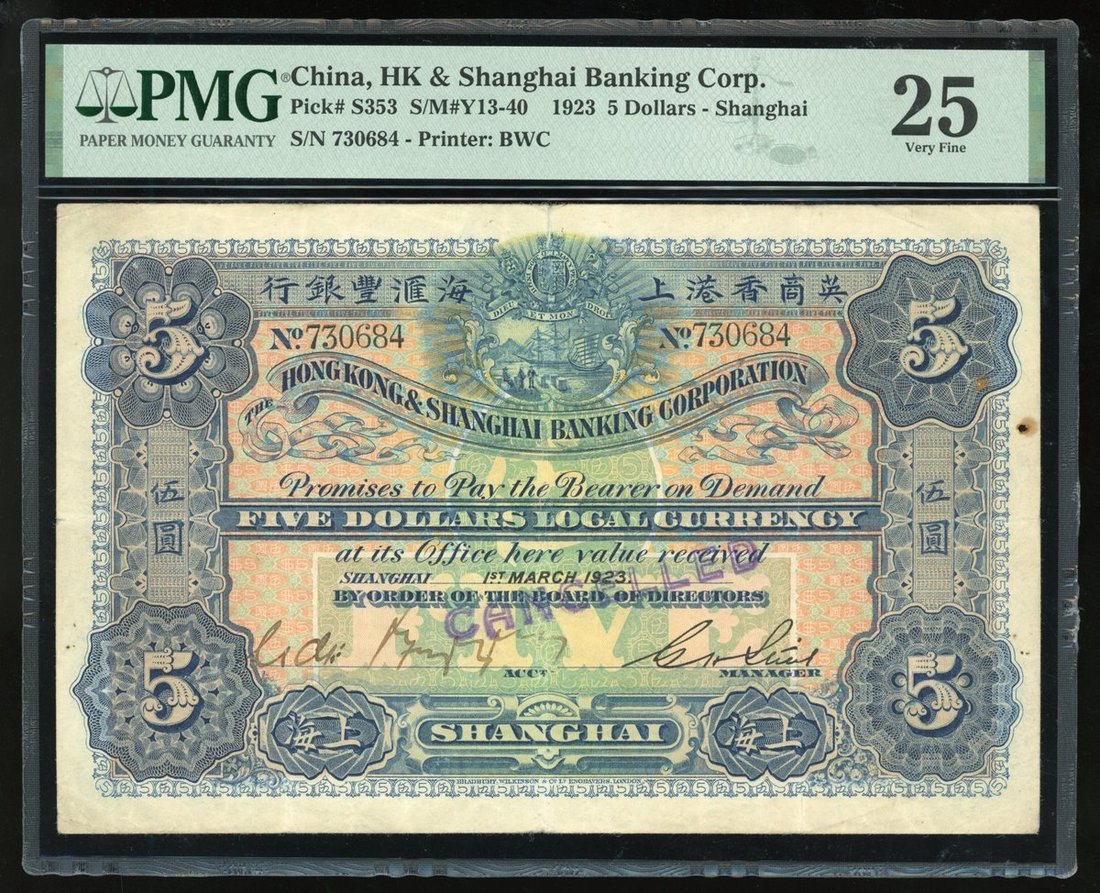 1923年香港上海匯豐銀行伍圓,上海地名,編號 730684,PMG 25,有蓋印註銷,有些微修補及銹蝕,品相上佳