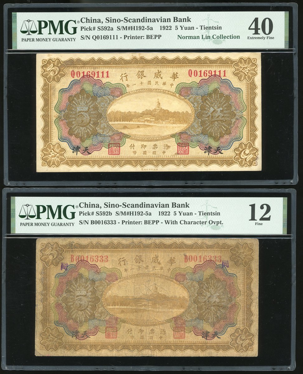 民國十一年華威銀行一組3枚,詳見圖示,包括伍圓兩枚,天津地名,及民國十年拾圓,編號Q0169111,B0016333,C0002554,PMG 12-40