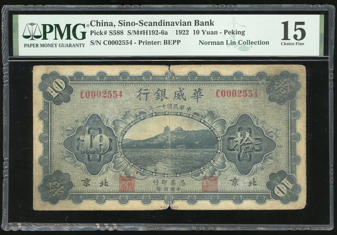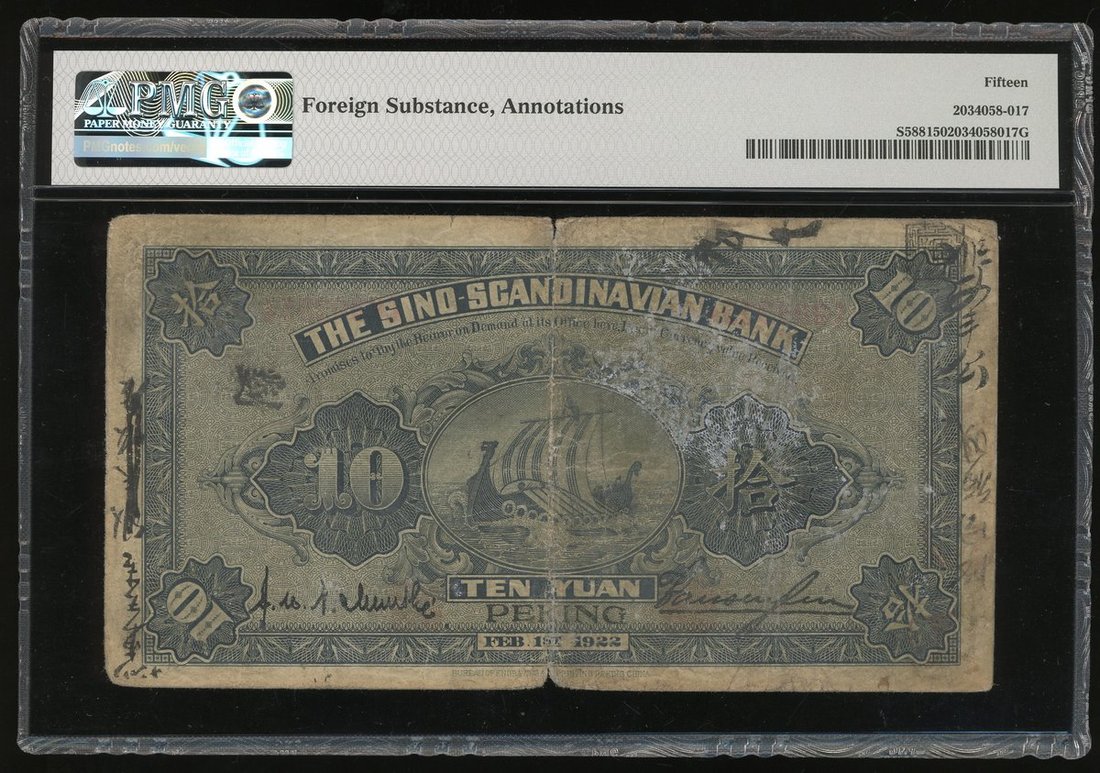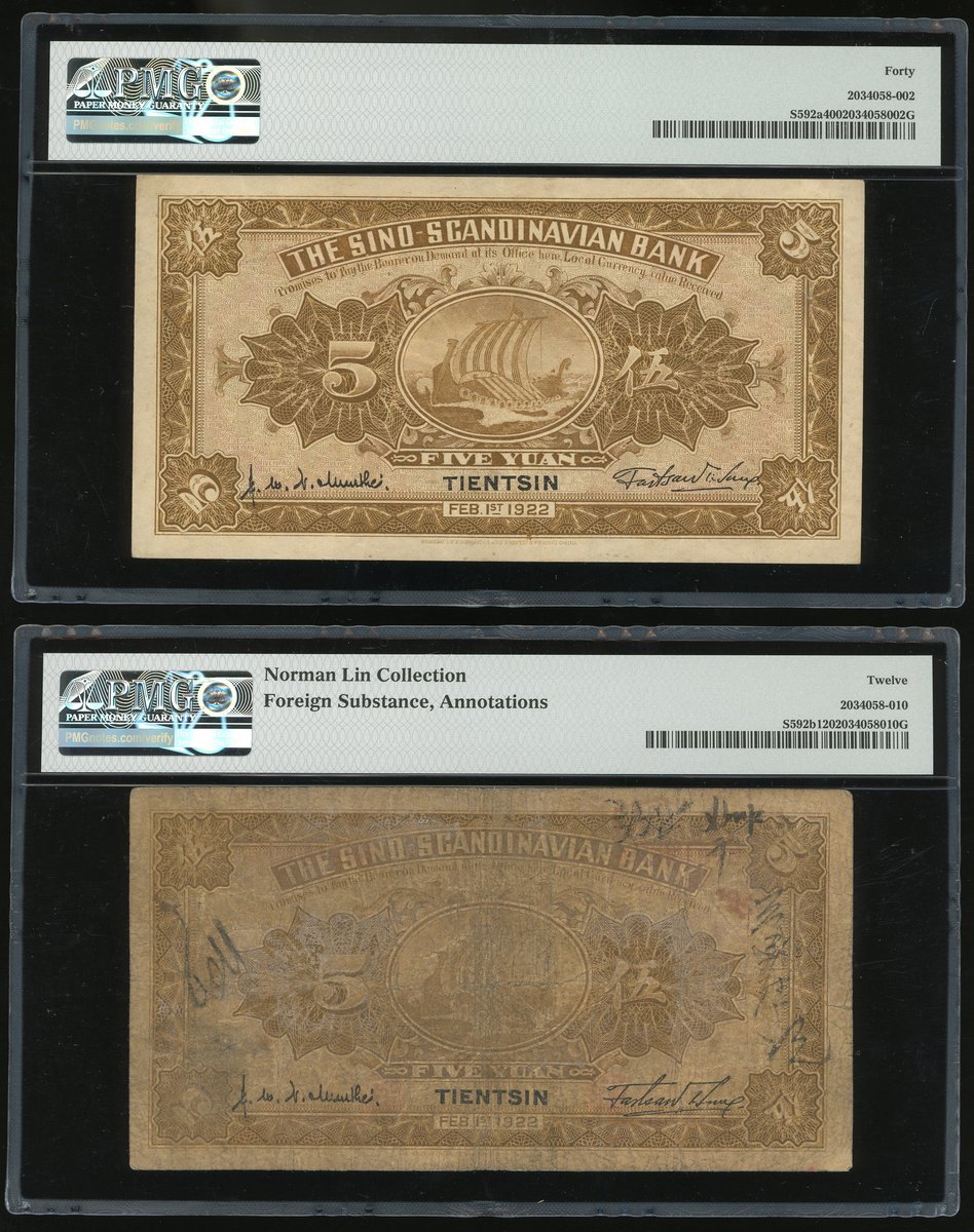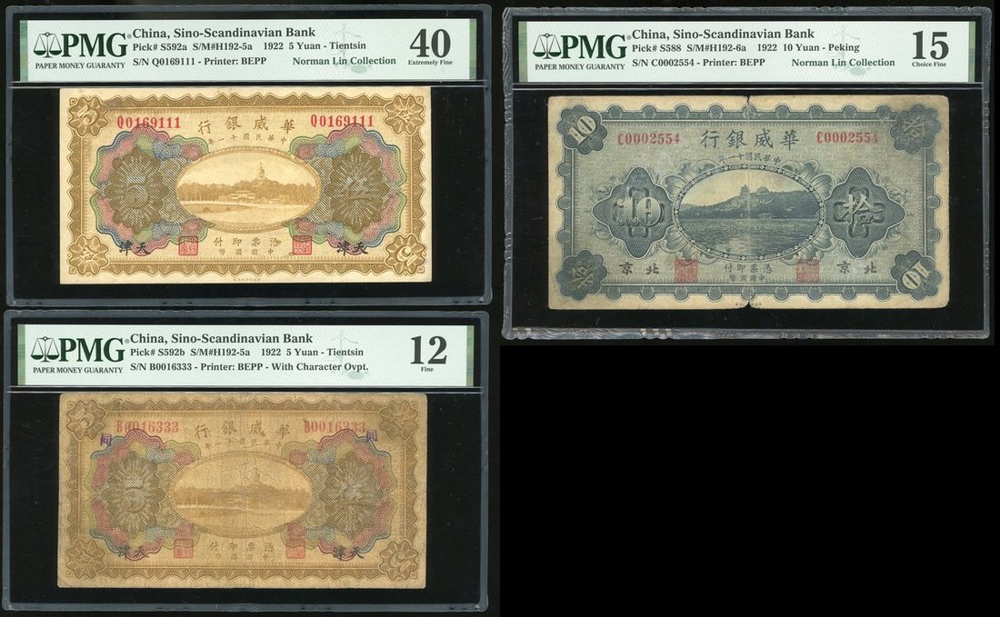 Sino-Scandivanian Bank, China, a group of 3x, 1922, including 5 yuan (Tientsin) and 10 yuan (Peking), (Pick S592a, S592b, S588), PMG 12 Fine (Foreign Substance, Annotations)-40 Extremely Fine, PMG 15 Choice Fine (Foreign Substance, Annotations) (3)