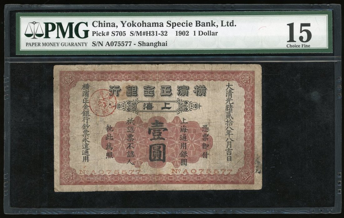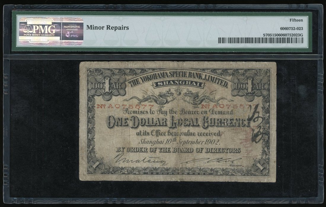 Yokohama Specie Bank, $1, 1902, Shanghai, serial number A075577, (Pick S705), PMG 15, fine, minor repairs.