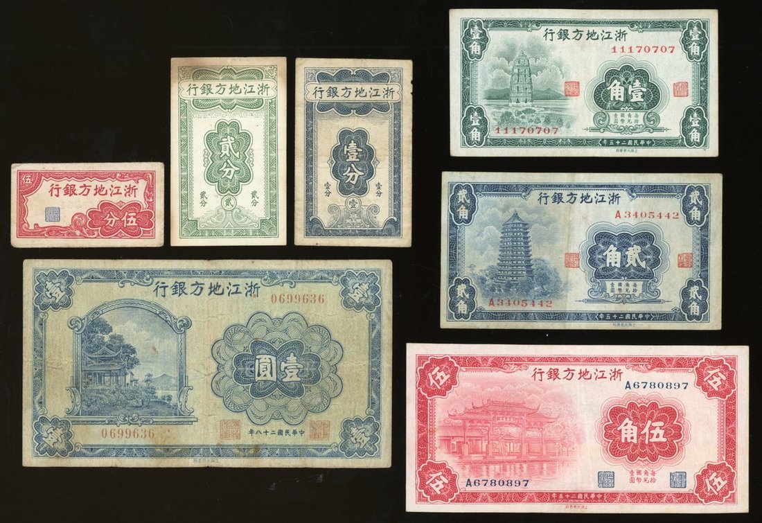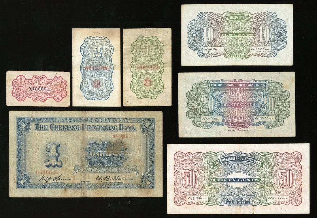 Chekiang Provincial Bank, China, a group of 7x, including, 10, 20 and 50 cents 1936, 1, 2 and 5 fen ND (1938) and 1 yuan 1939,