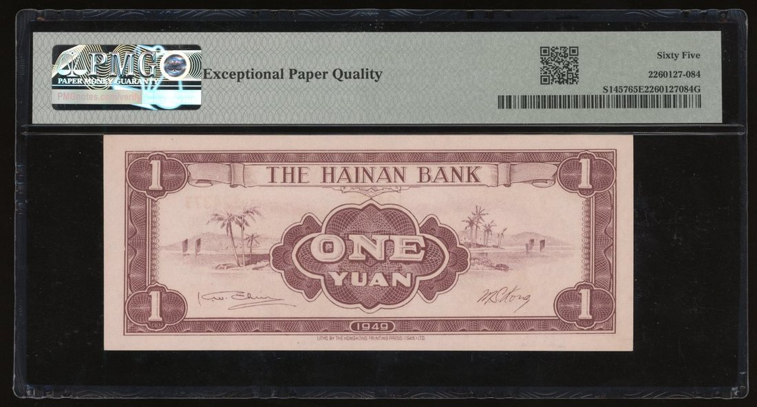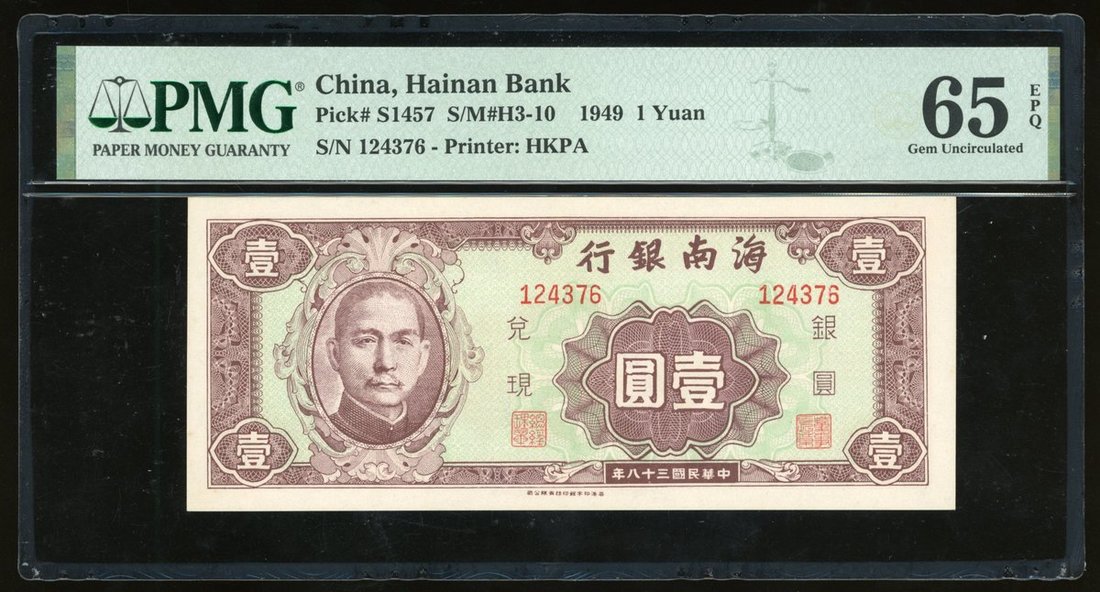 Hainan Bank, China, 1 yuan, Year 38 (1949), serial number 124376, (Pick S1457), PMG 65EPQ
