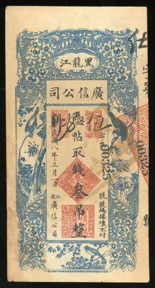Kwang Sing Company, Heilungkiang, China, 3 tiao, Year 8 (1919), serial number 00325, (Pick S1561), stained, pressed, very fine