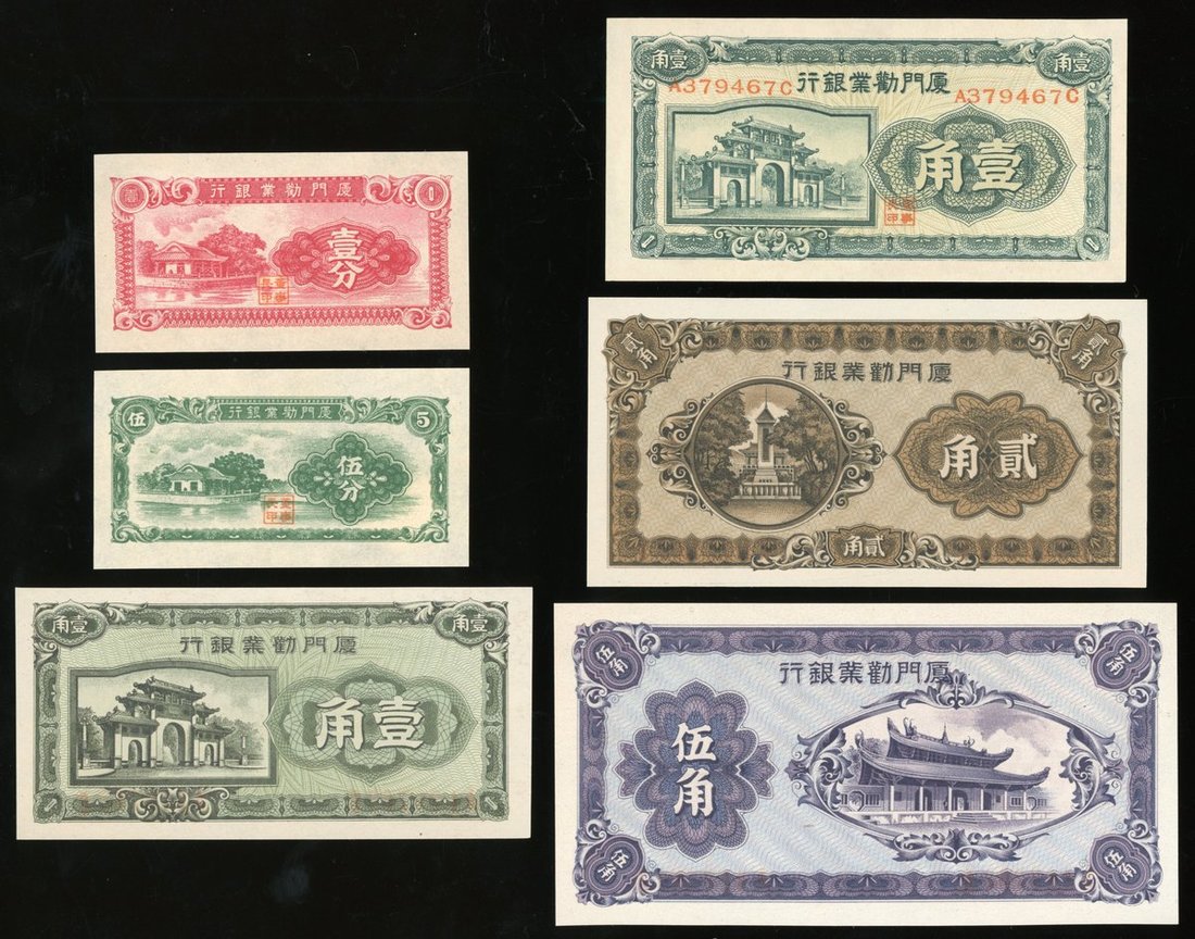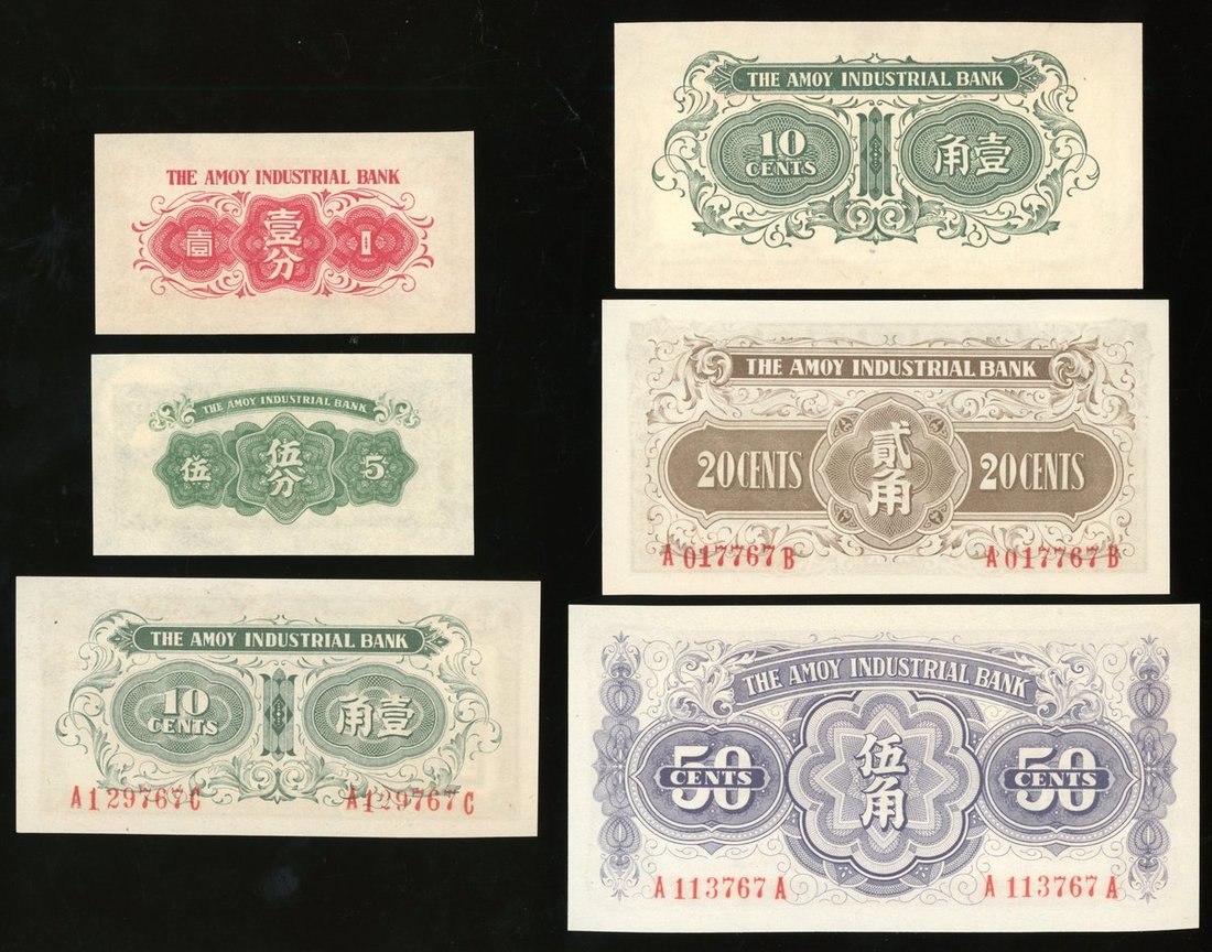 The Amoy Industrial Bank, a lot of 1, 5 fen, 2x 1 jiao, 2 and 5 jiao, (Pick Unlisted), uncirculated.(6)