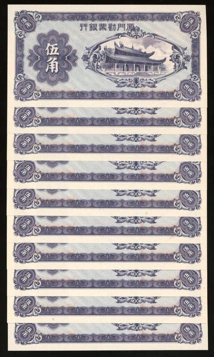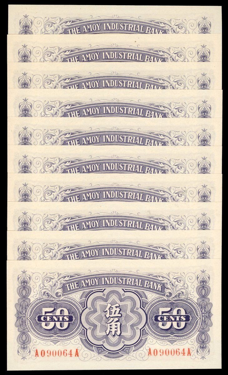 Amoy Industrial Bank, China, consecutive 50 cents (10), ND (1940), serial numbers A090064-73A, (Pick S1658a), uncirculated (10)