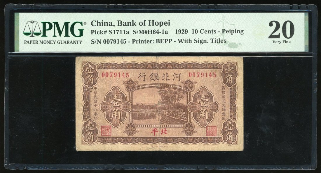 Bank of Hopei, China, 10 cents, 1929, Peiping, serial number 0079145, (Pick S1711a), PMG 20 Very Fine
