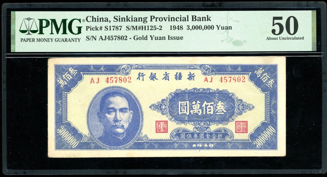 Sinkiang Provincial Bank, China, 3,000,000 yuan, Gold Yuan Issue, Year 37(1948), serial number AJ457802, (Pick S1787), PMG 50 About Uncirculated.