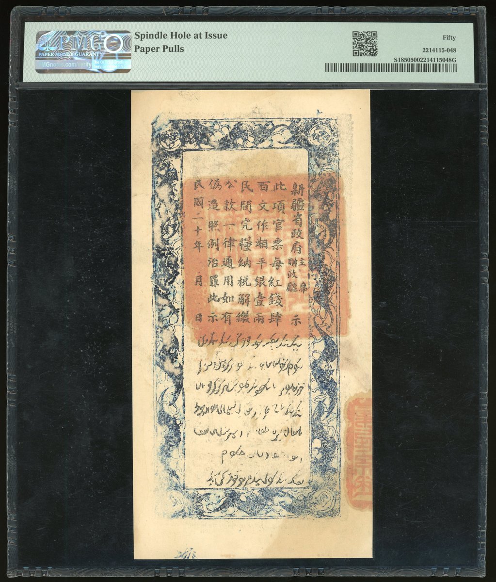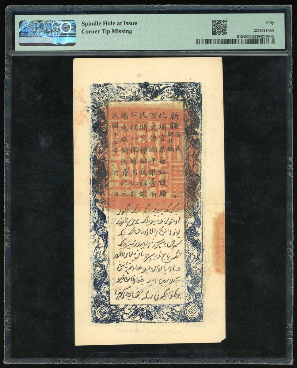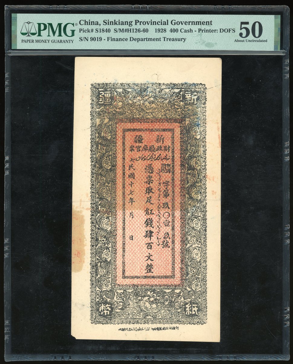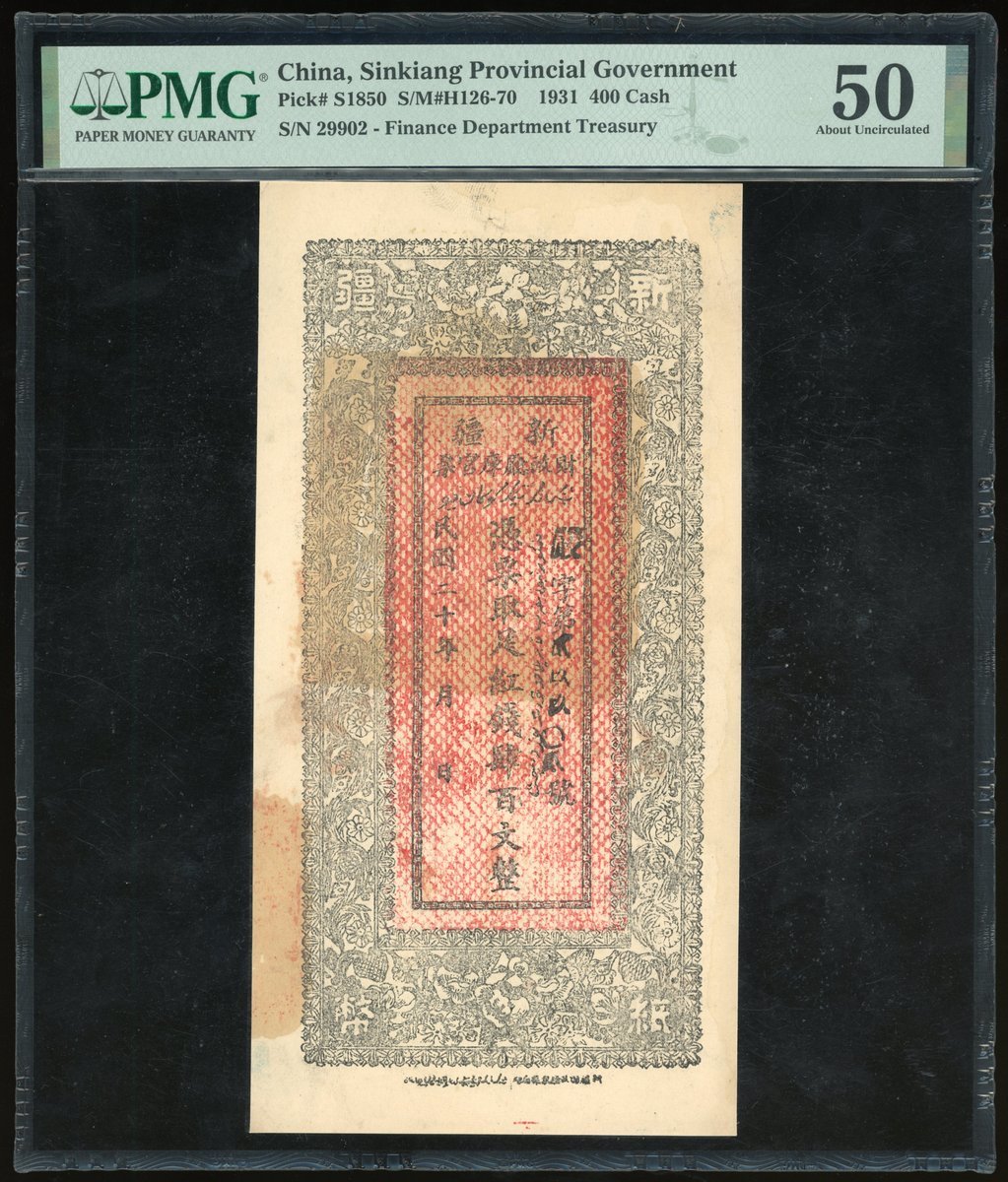 新疆財政廳庫官票一組2枚400文,分別民國十七,二十年,PMG 50,有發行時留下之釘孔及左下有缺,PMG 50,有發行時留下之釘孔及壁裂紋