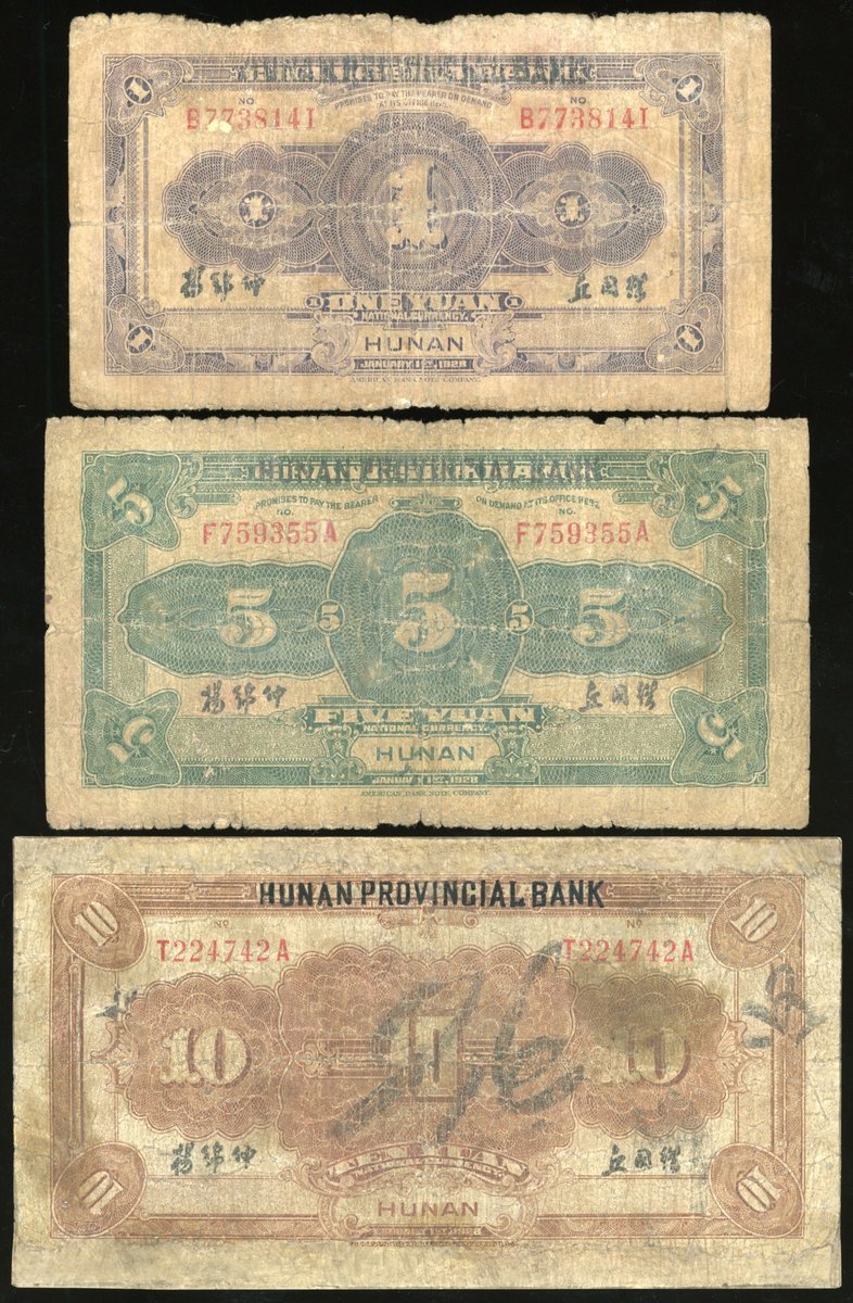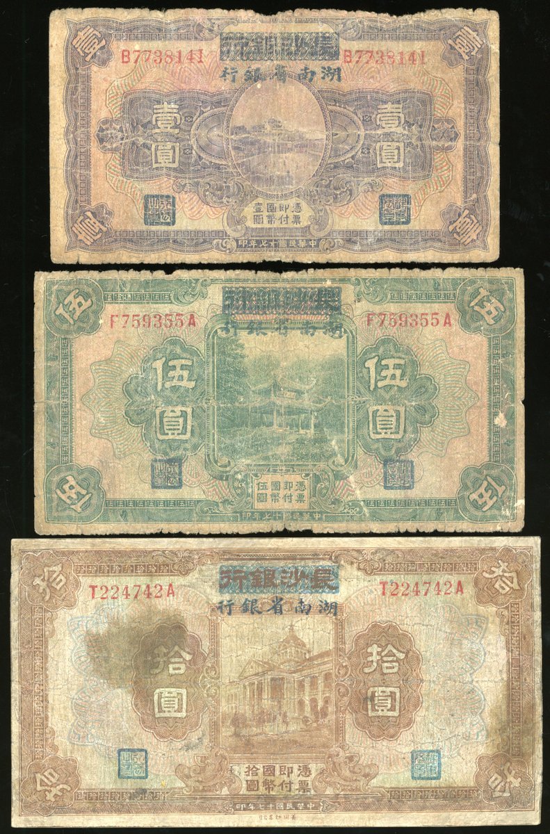 民國十七年湖南省銀行一組3枚,包括,壹圓,五圓,拾圓,拾圓有修補,P品相