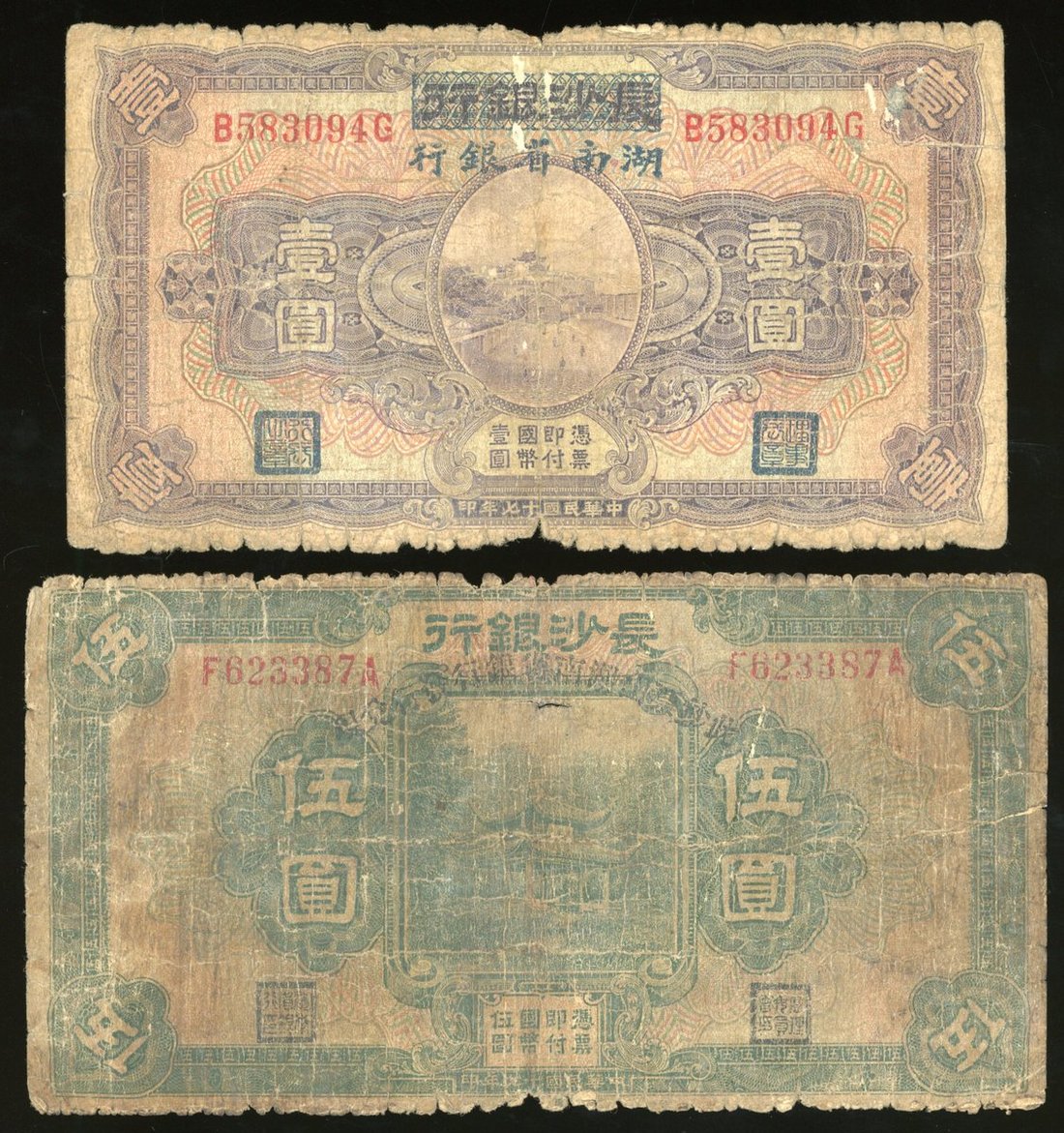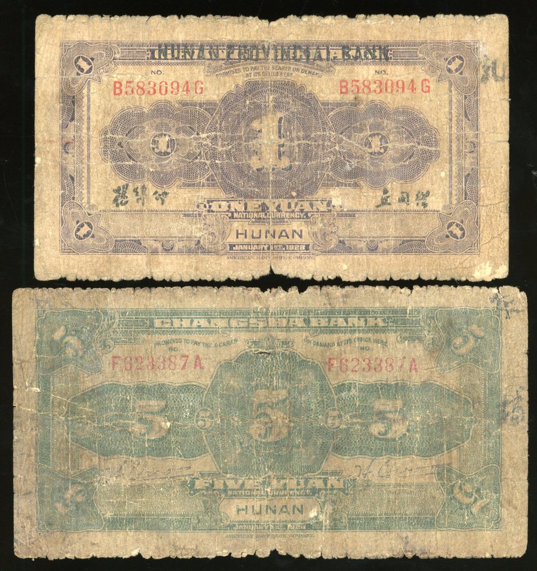 Hunan Provincial Bank, China, 1 Yuan and 5 yuan, overprint on Bank of Changsha, 1928, serial number B 583094 G and F 623387 A,