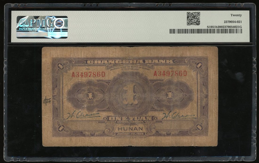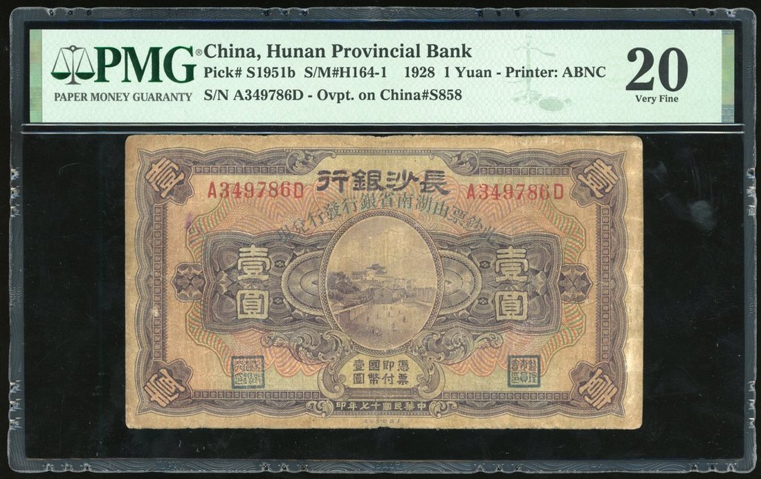 Hunan Provincial Bank, China, 1 yuan, Year 17 (1928), serial number A349786D, overprinted on Changsha Bank 1 yuan,